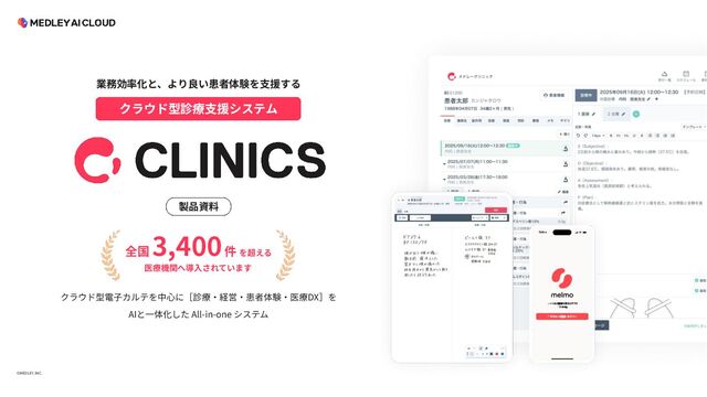 3,400件 を超える 医療機関へ導⼊されています クラウド型電⼦カルテを中⼼に[診療‧経営‧患者体験‧医療DX]を AIと⼀体化した All-in-one システム