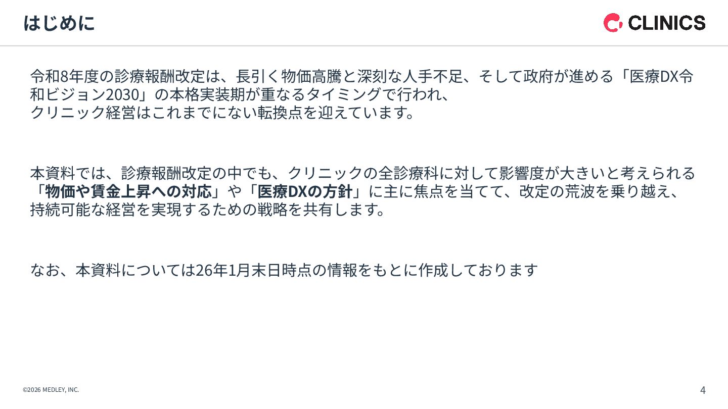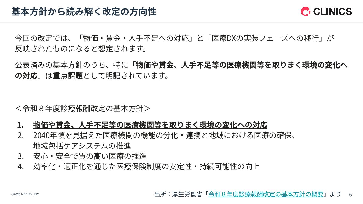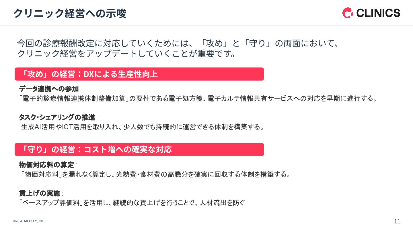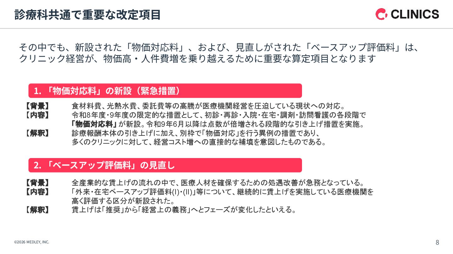 が新設。令和9年6月以降は点数が倍増される段階的な引き上げ措置を実施。 【解釈】 診療報酬本体の引き上げに加え、別枠で「物価対応」を行う異例の措置であり、 多くのクリニックに対して、経営コスト増への直接的な補填を意図したものである。 【背景】 全産業的な賃上げの流れの中で、医療人材を確保するための処遇改善が急務となっている。 【内容】 「外来・在宅ベースアップ評価料(I)・(II)」等について、継続的に賃上げを実施している医療機関を 高く評価する区分が新設された。 【解釈】 賃上げは「推奨」から「経営上の義務」へとフェーズが変化したといえる。 1. 「物価対応料」の新設(緊急措置) 2. 「ベースアップ評価料」の⾒直し その中でも、新設された「物価対応料」、および、⾒直しがされた「ベースアップ評価料」は、 クリニック経営が、物価⾼‧⼈件費増を乗り越えるために重要な算定項⽬となります