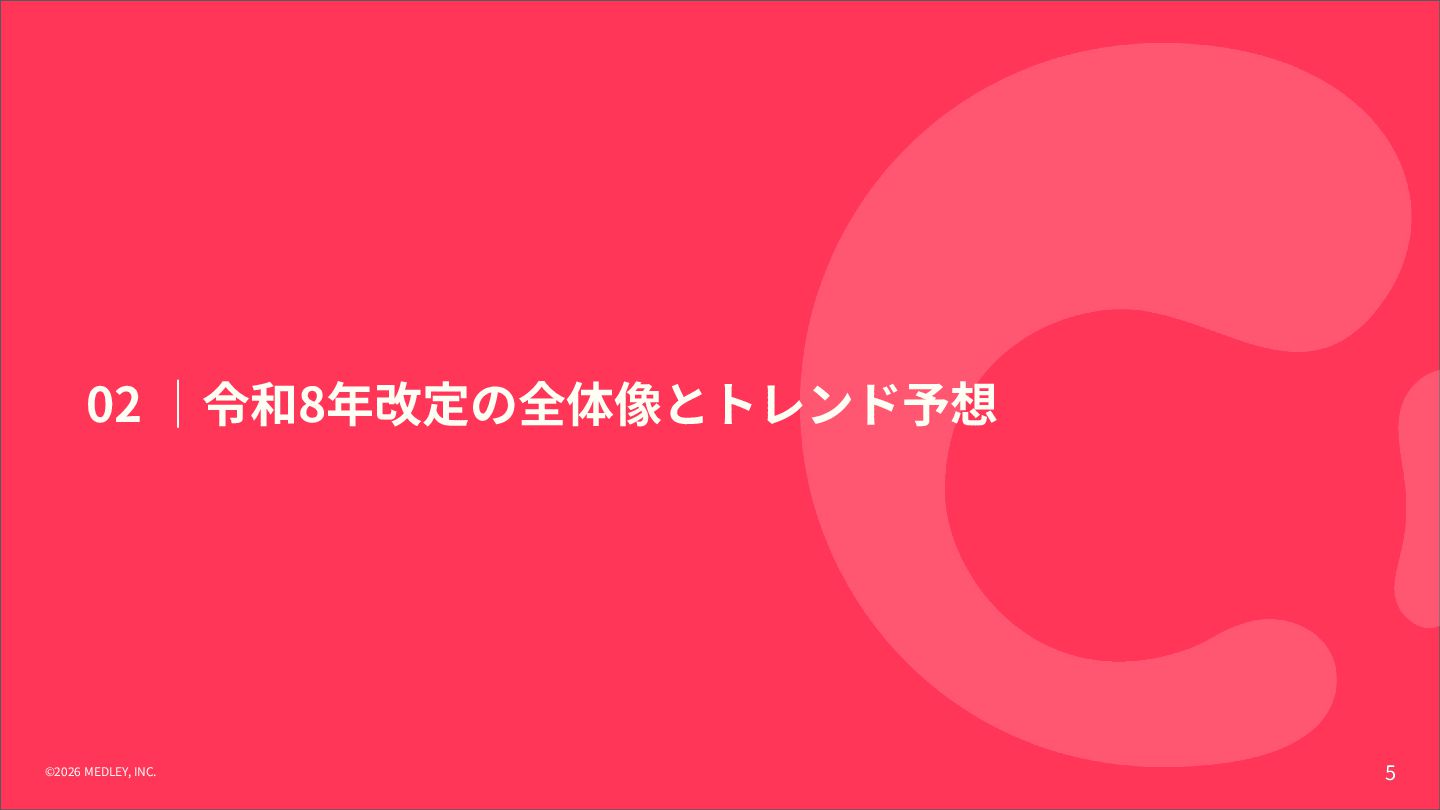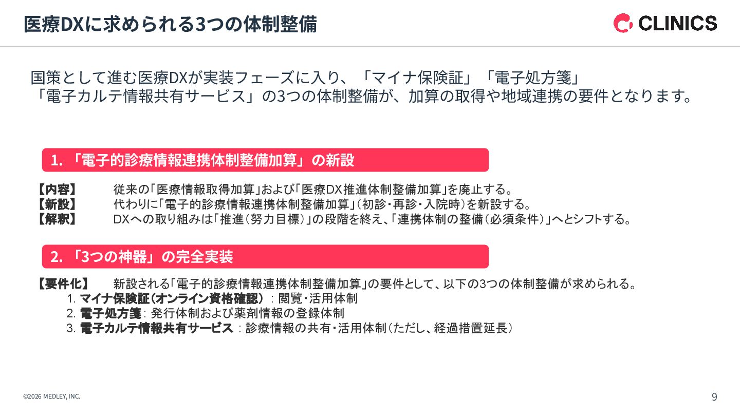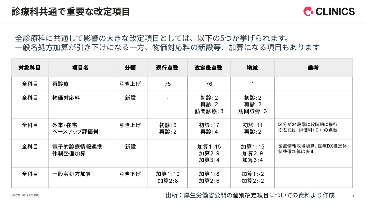 が新設。令和9年6月以降は点数が倍増される段階的な引き上げ措置を実施。 【解釈】 診療報酬本体の引き上げに加え、別枠で「物価対応」を行う異例の措置であり、 多くのクリニックに対して、経営コスト増への直接的な補填を意図したものである。 【背景】 全産業的な賃上げの流れの中で、医療人材を確保するための処遇改善が急務となっている。 【内容】 「外来・在宅ベースアップ評価料(I)・(II)」等について、継続的に賃上げを実施している医療機関を 高く評価する区分が新設された。 【解釈】 賃上げは「推奨」から「経営上の義務」へとフェーズが変化したといえる。 1. 「物価対応料」の新設(緊急措置) 2. 「ベースアップ評価料」の⾒直し その中でも、新設された「物価対応料」、および、⾒直しがされた「ベースアップ評価料」は、 クリニック経営が、物価⾼‧⼈件費増を乗り越えるために重要な算定項⽬となります