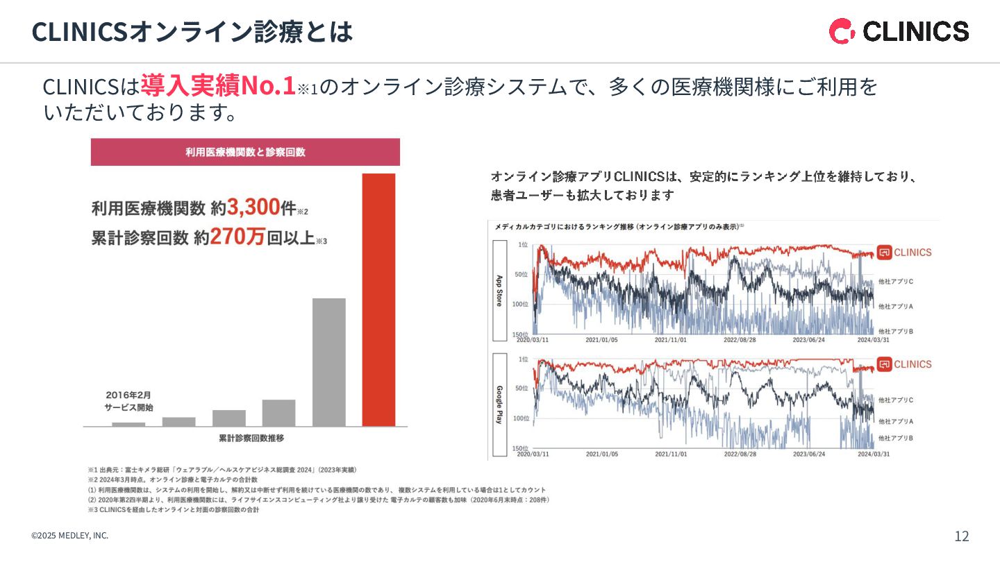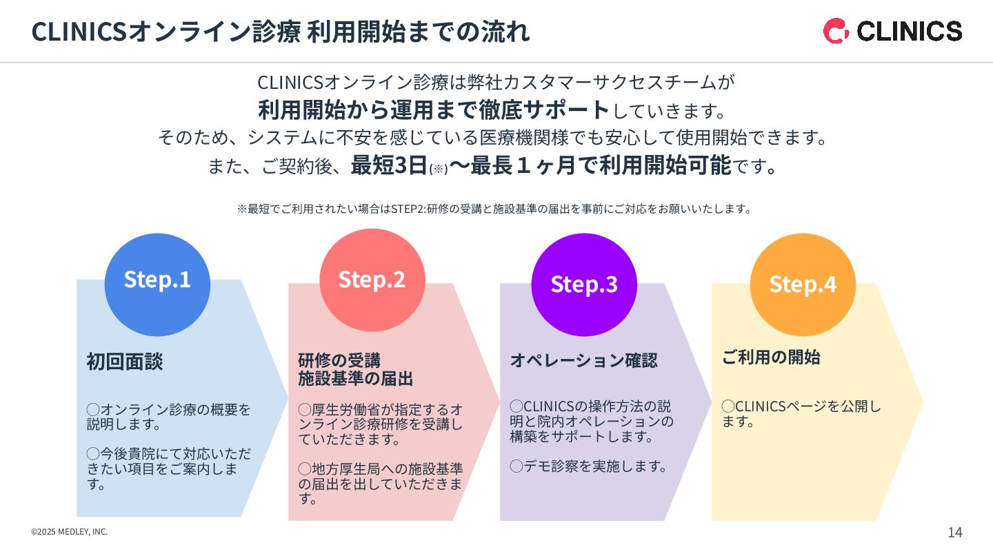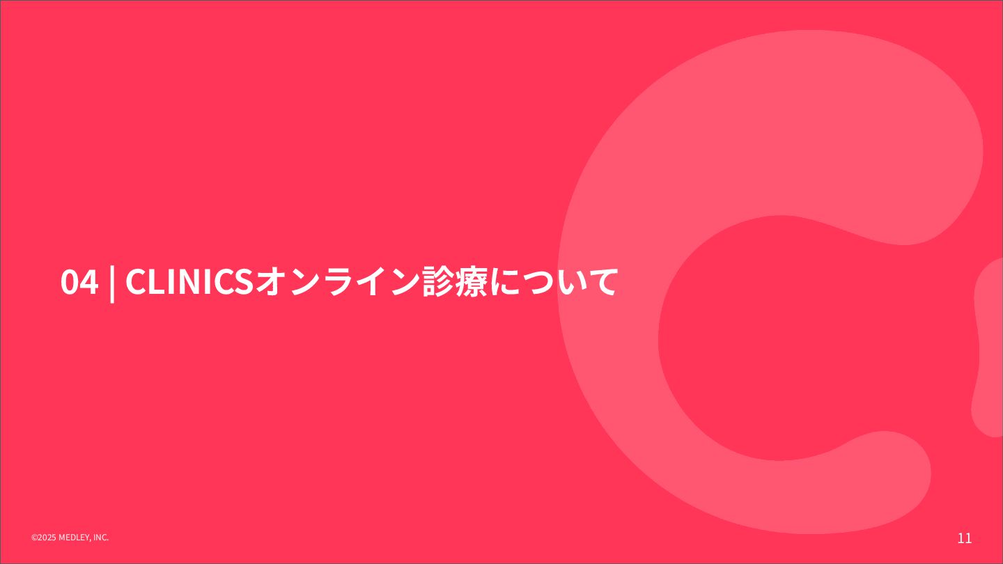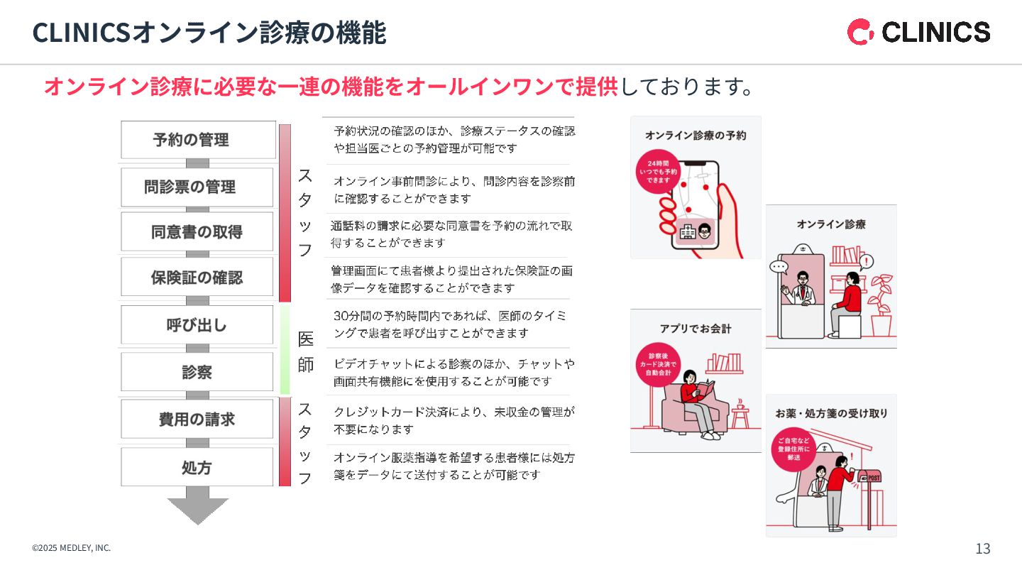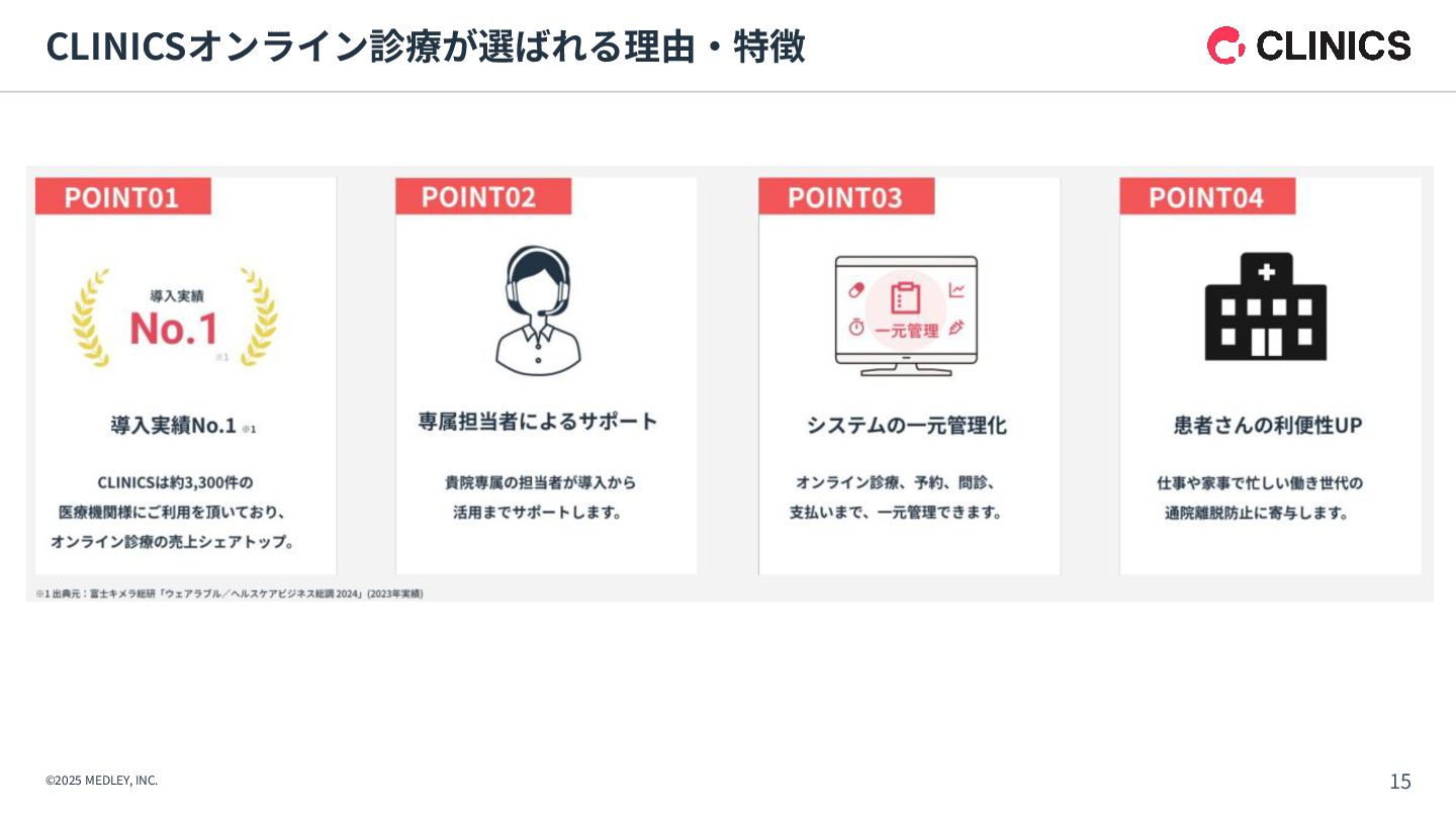 オンライン診療 チェックイン機能(マイナ保険証‧アプリ*1) スマート会計*1 オンライン資格確認(外来診療) 居宅同意型オンライン資格確認 (訪問診療‧オンライン診療) 電⼦処⽅箋 AI要約アシスト*1 AI⽂書アシスト*2 Reserve with Google連携*1 (マップからCLINICS予約に遷移) 他社システム連携機能 カルテ‧レセコン かかりつけ⽀援機能 医療DX機能 AIアシスト *1:2025年秋以降順次リリース予定 *2:リリース時期未定(開発中)