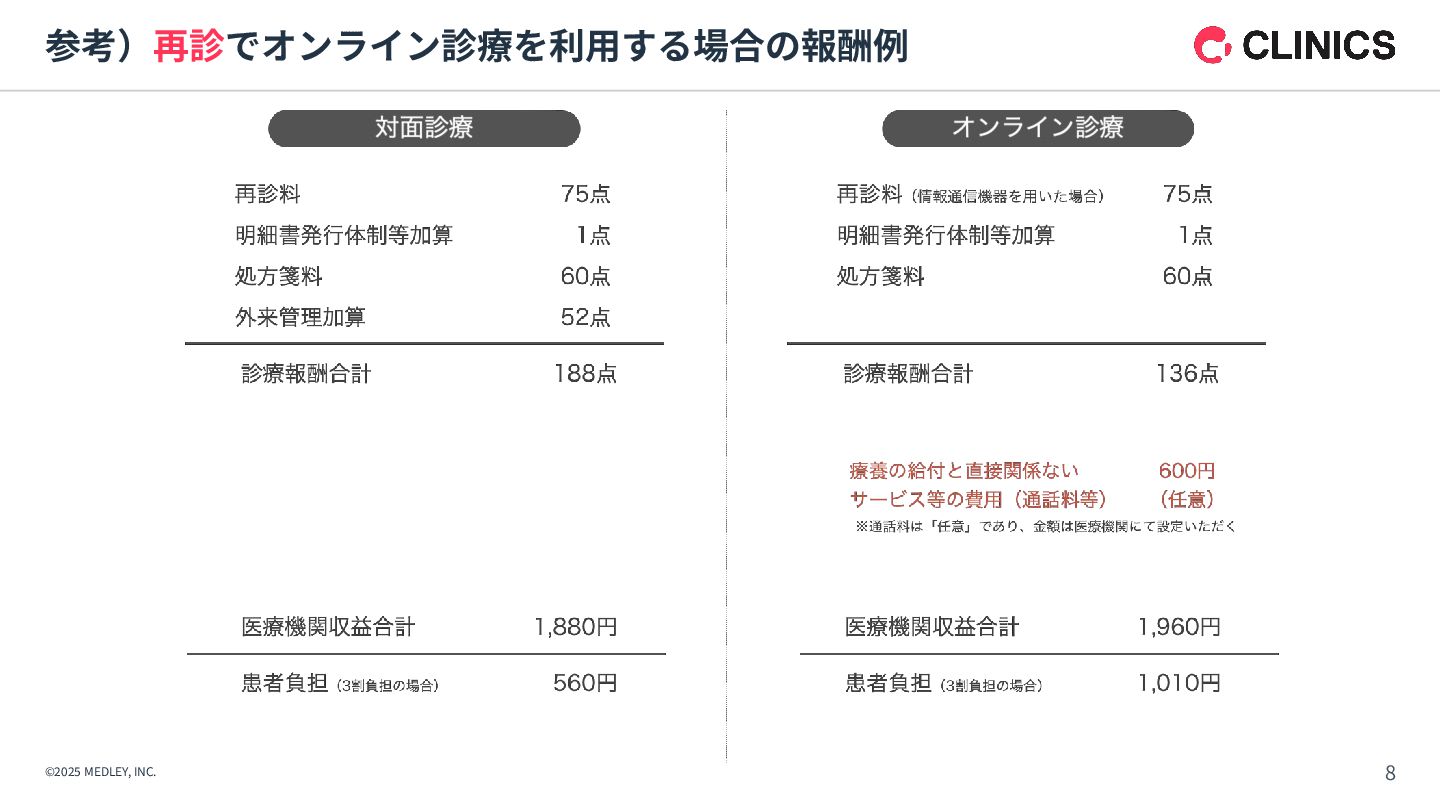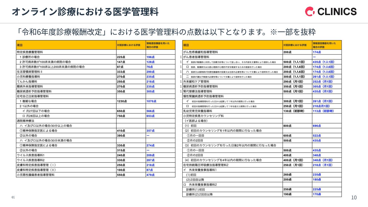 オンライン診療 チェックイン機能(マイナ保険証‧アプリ*1) スマート会計*1 オンライン資格確認(外来診療) 居宅同意型オンライン資格確認 (訪問診療‧オンライン診療) 電⼦処⽅箋 AI要約アシスト*1 AI⽂書アシスト*2 Reserve with Google連携*1 (マップからCLINICS予約に遷移) 他社システム連携機能 カルテ‧レセコン かかりつけ⽀援機能 医療DX機能 AIアシスト *1:2025年秋以降順次リリース予定 *2:リリース時期未定(開発中)