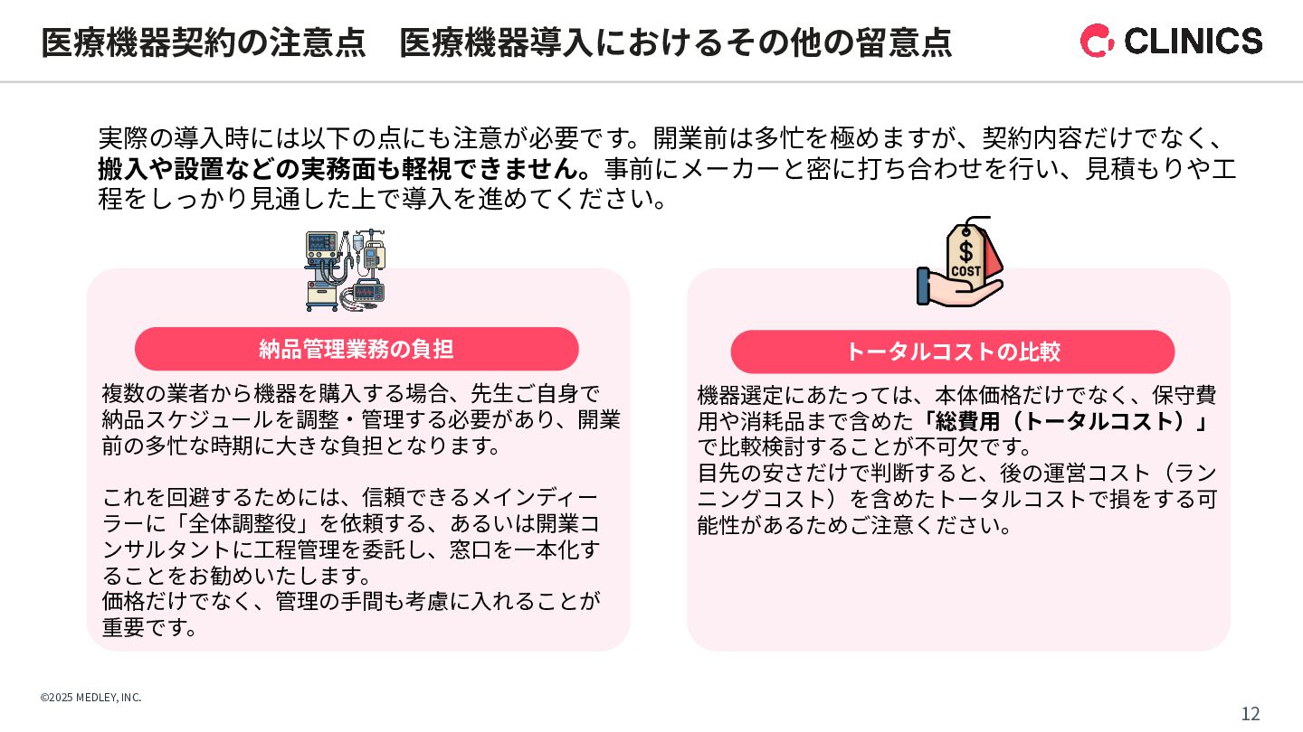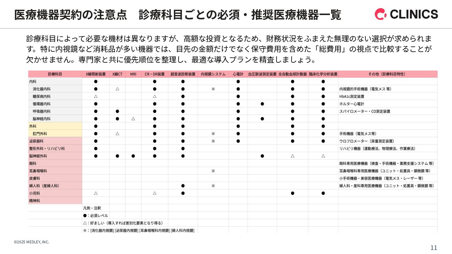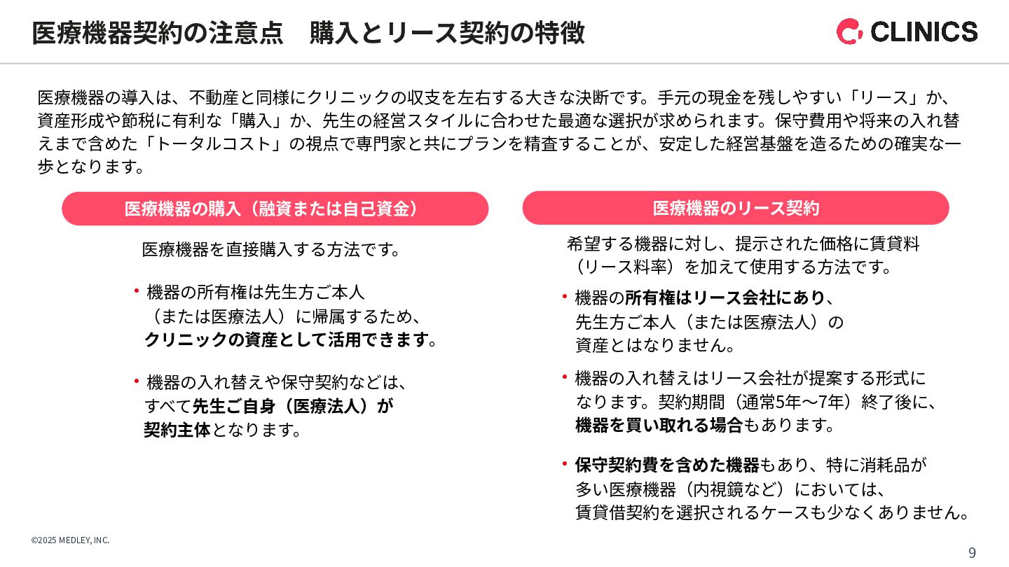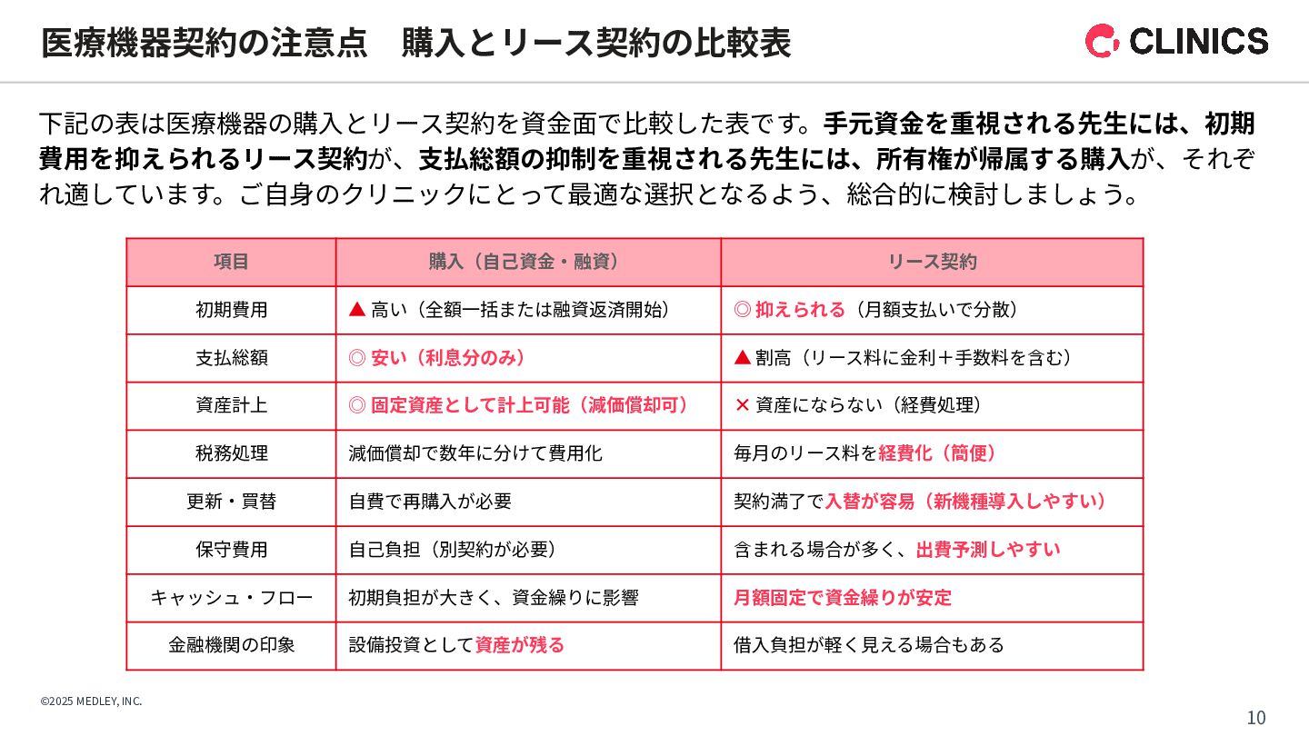 ⾼い(全額⼀括または融資返済開始) ◎ 抑えられる(⽉額⽀払いで分散) ⽀払総額 ◎ 安い(利息分のみ) ▲ 割⾼(リース料に⾦利+⼿数料を含む) 資産計上 ◎ 固定資産として計上可能(減価償却可) × 資産にならない(経費処理) 税務処理 減価償却で数年に分けて費⽤化 毎⽉のリース料を経費化(簡便) 更新‧買替 ⾃費で再購⼊が必要 契約満了で⼊替が容易(新機種導⼊しやすい) 保守費⽤ ⾃⼰負担(別契約が必要) 含まれる場合が多く、出費予測しやすい キャッシュ‧フロー 初期負担が⼤きく、資⾦繰りに影響 ⽉額固定で資⾦繰りが安定 ⾦融機関の印象 設備投資として資産が残る 借⼊負担が軽く⾒える場合もある 下記の表は医療機器の購⼊とリース契約を資⾦⾯で⽐較した表です。⼿元資⾦を重視される先⽣には、初期 費⽤を抑えられるリース契約が、⽀払総額の抑制を重視される先⽣には、所有権が帰属する購⼊が、それぞ れ適しています。ご⾃⾝のクリニックにとって最適な選択となるよう、総合的に検討しましょう。