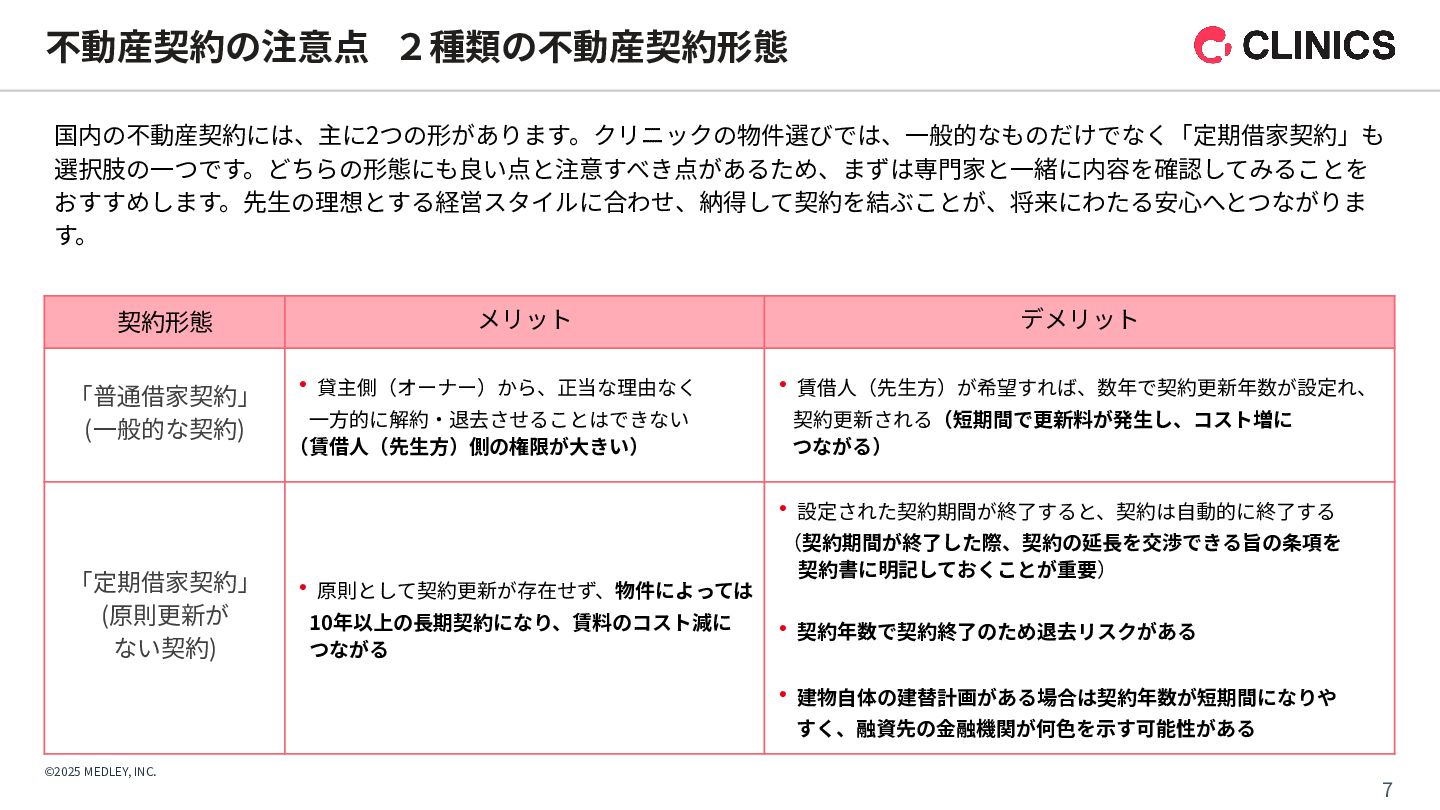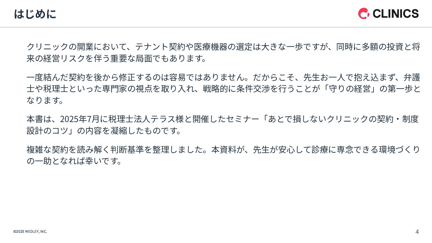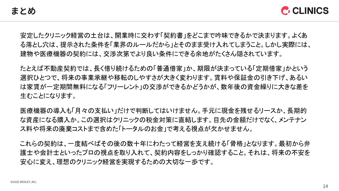 ⾼い(全額⼀括または融資返済開始) ◎ 抑えられる(⽉額⽀払いで分散) ⽀払総額 ◎ 安い(利息分のみ) ▲ 割⾼(リース料に⾦利+⼿数料を含む) 資産計上 ◎ 固定資産として計上可能(減価償却可) × 資産にならない(経費処理) 税務処理 減価償却で数年に分けて費⽤化 毎⽉のリース料を経費化(簡便) 更新‧買替 ⾃費で再購⼊が必要 契約満了で⼊替が容易(新機種導⼊しやすい) 保守費⽤ ⾃⼰負担(別契約が必要) 含まれる場合が多く、出費予測しやすい キャッシュ‧フロー 初期負担が⼤きく、資⾦繰りに影響 ⽉額固定で資⾦繰りが安定 ⾦融機関の印象 設備投資として資産が残る 借⼊負担が軽く⾒える場合もある 下記の表は医療機器の購⼊とリース契約を資⾦⾯で⽐較した表です。⼿元資⾦を重視される先⽣には、初期 費⽤を抑えられるリース契約が、⽀払総額の抑制を重視される先⽣には、所有権が帰属する購⼊が、それぞ れ適しています。ご⾃⾝のクリニックにとって最適な選択となるよう、総合的に検討しましょう。