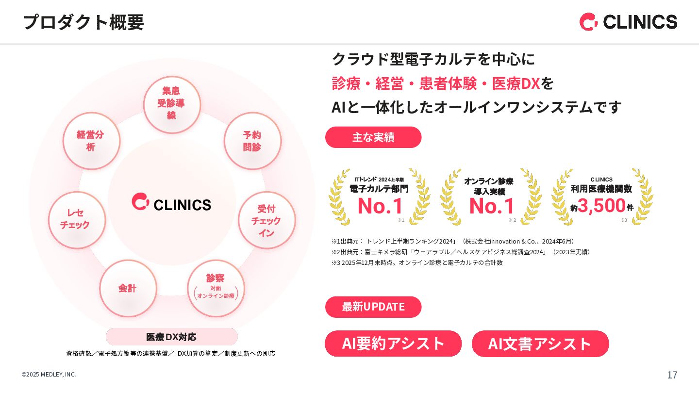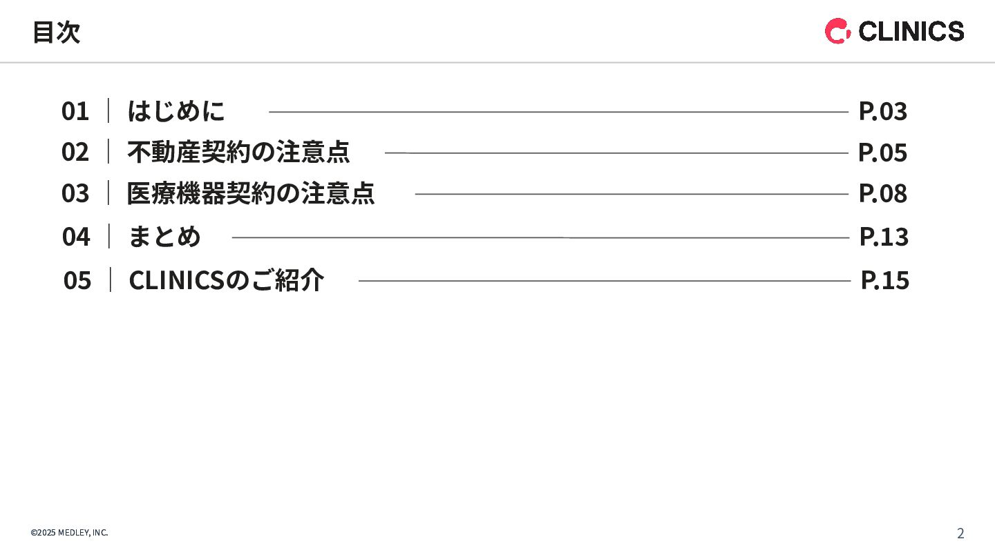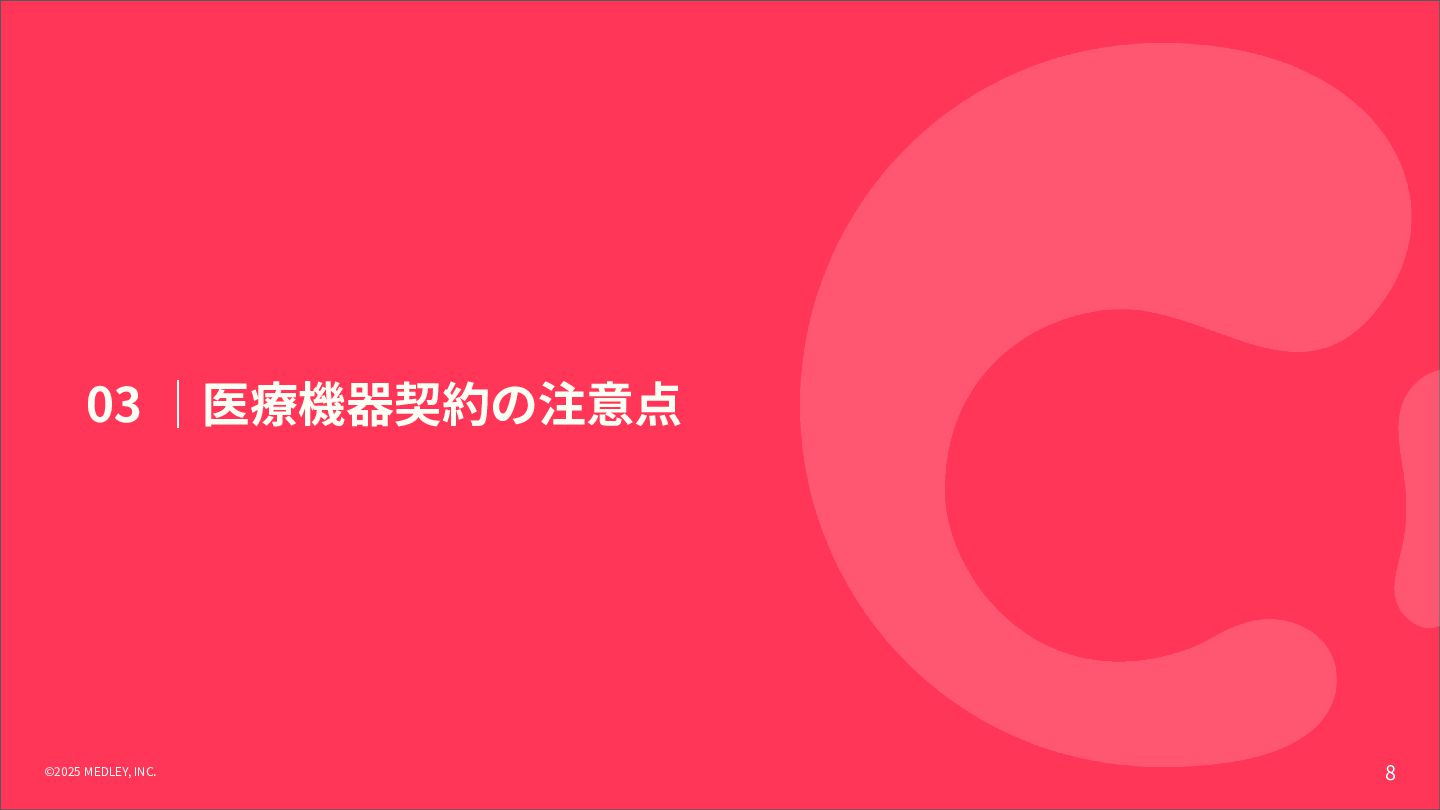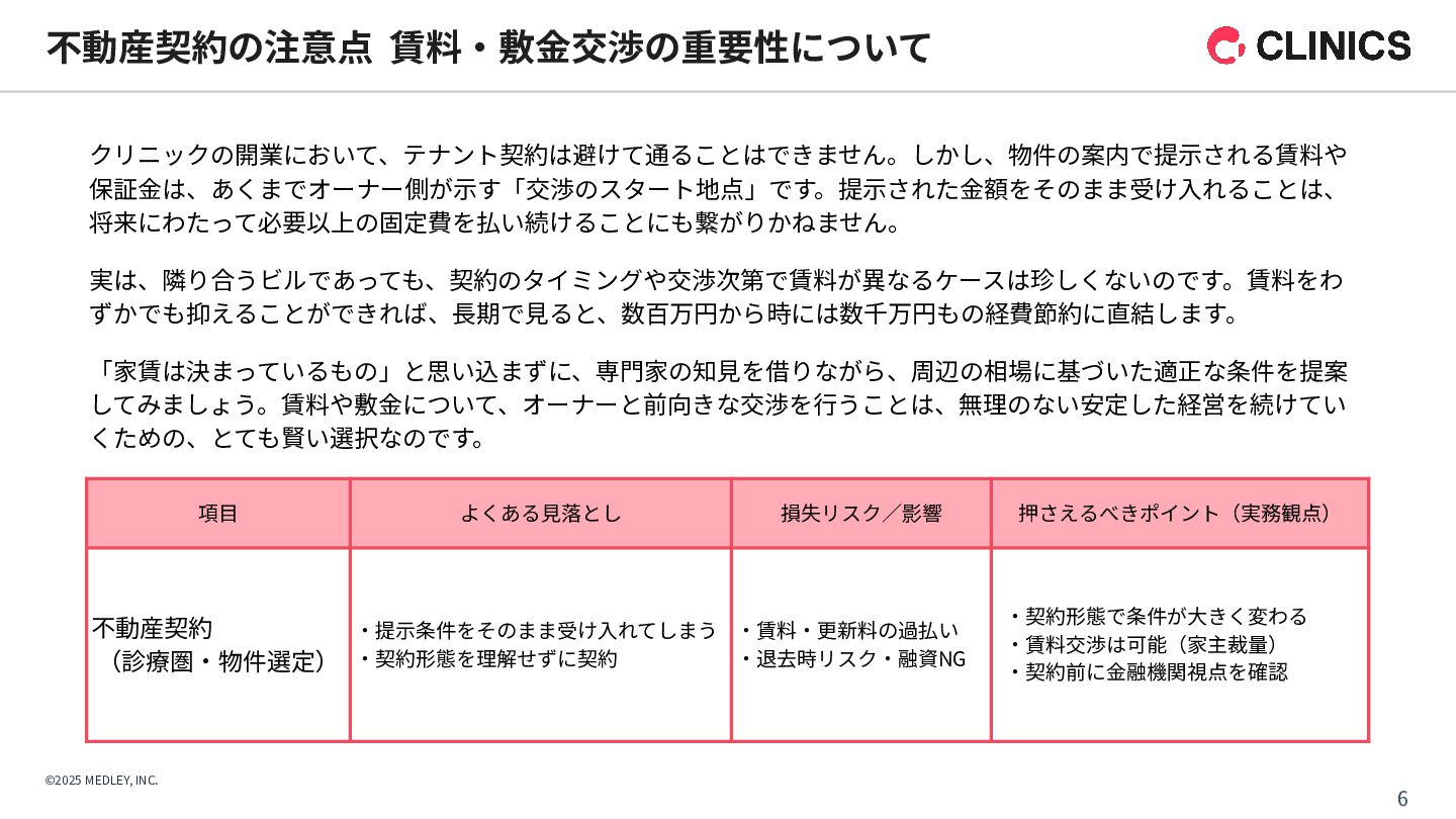 ⾼い(全額⼀括または融資返済開始) ◎ 抑えられる(⽉額⽀払いで分散) ⽀払総額 ◎ 安い(利息分のみ) ▲ 割⾼(リース料に⾦利+⼿数料を含む) 資産計上 ◎ 固定資産として計上可能(減価償却可) × 資産にならない(経費処理) 税務処理 減価償却で数年に分けて費⽤化 毎⽉のリース料を経費化(簡便) 更新‧買替 ⾃費で再購⼊が必要 契約満了で⼊替が容易(新機種導⼊しやすい) 保守費⽤ ⾃⼰負担(別契約が必要) 含まれる場合が多く、出費予測しやすい キャッシュ‧フロー 初期負担が⼤きく、資⾦繰りに影響 ⽉額固定で資⾦繰りが安定 ⾦融機関の印象 設備投資として資産が残る 借⼊負担が軽く⾒える場合もある 下記の表は医療機器の購⼊とリース契約を資⾦⾯で⽐較した表です。⼿元資⾦を重視される先⽣には、初期 費⽤を抑えられるリース契約が、⽀払総額の抑制を重視される先⽣には、所有権が帰属する購⼊が、それぞ れ適しています。ご⾃⾝のクリニックにとって最適な選択となるよう、総合的に検討しましょう。