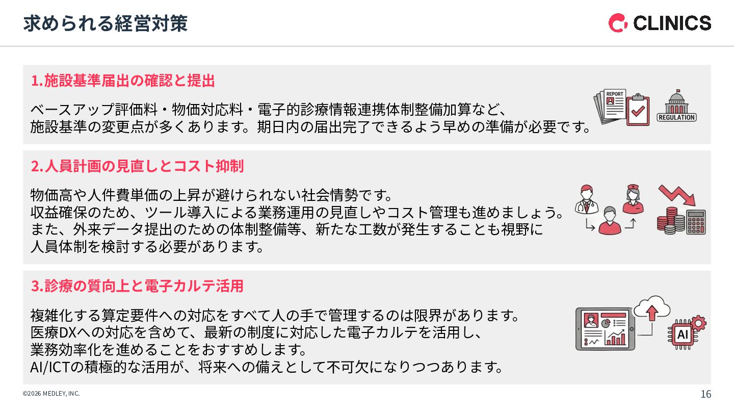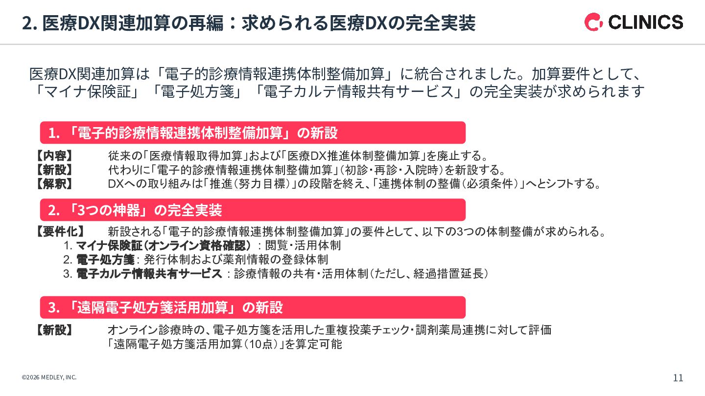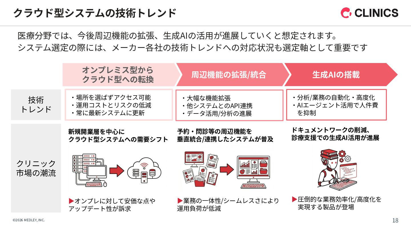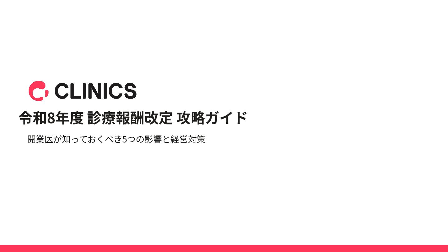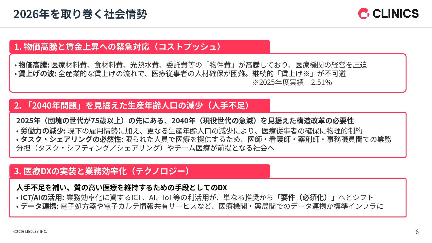 CLINICS 予約 問診 経営分 析 受付 チェック イン レセ チェック 集患 受診導 線 診察 対⾯ オンライン診療 会計 医療DX対応 資格確認/電子処方箋等の連携基盤/ DX加算の算定/制度更新への即応 AI要約アシスト AI⽂書アシスト ITトレンド 2024上半期 電子カルテ部門 No.1 ※1 オンライン診療 導入実績 No.1 ※2 CLINICS 利用医療機関数 約 件 3,500 ※3 ※1出典元: トレンド上半期ランキング2024」(株式会社innovation & Co.、2024年6⽉) ※2出典元:富⼠キメラ総研「ウェアラブル∕ヘルスケアビジネス総調査2024」(2023年実績) ※3 2025年12⽉末時点。オンライン診療と電⼦カルテの合計数