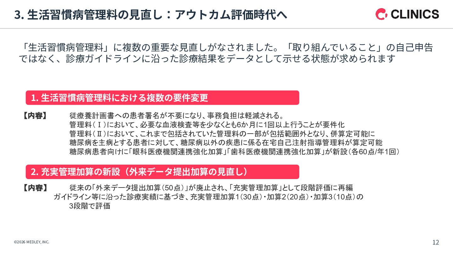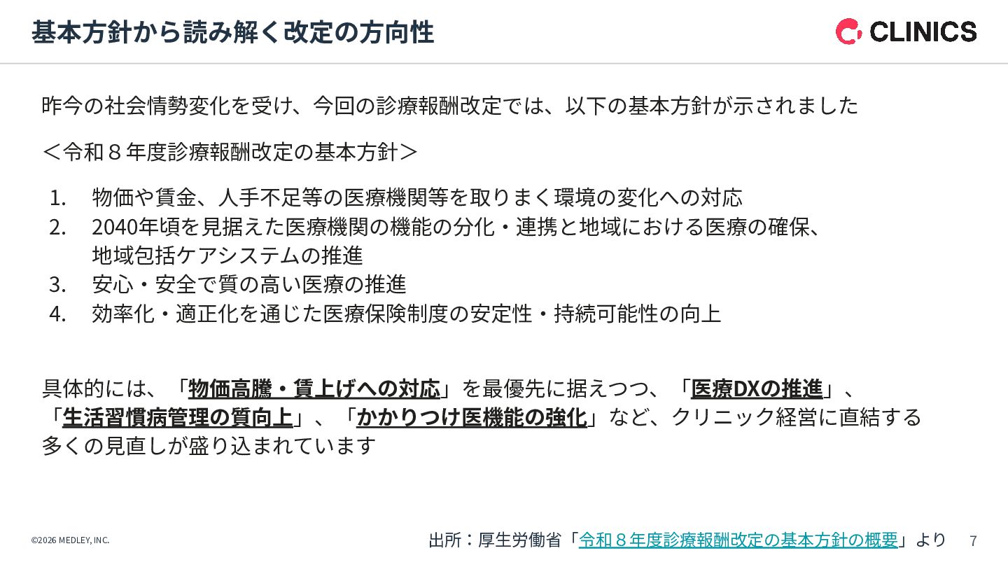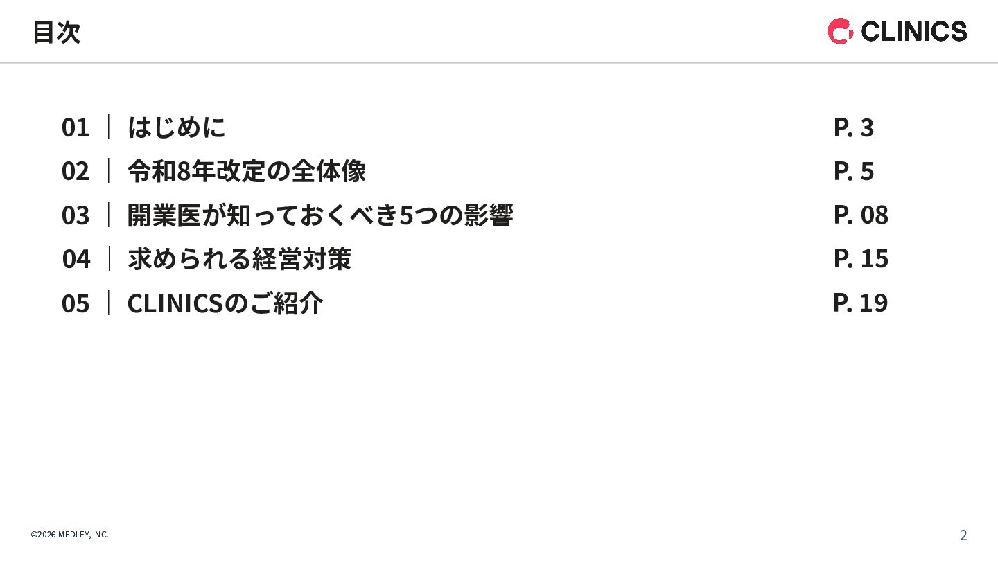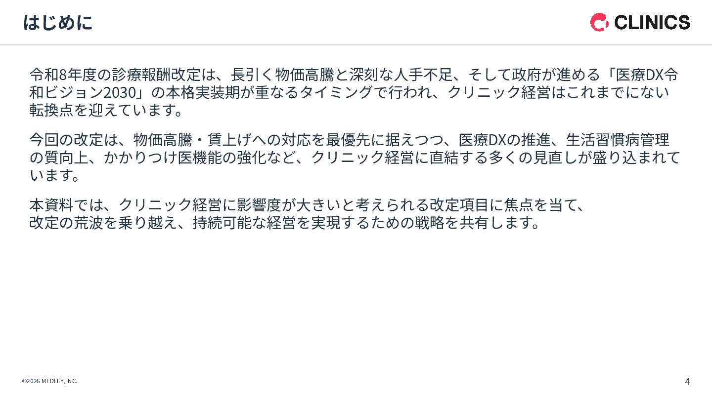 CLINICS 予約 問診 経営分 析 受付 チェック イン レセ チェック 集患 受診導 線 診察 対⾯ オンライン診療 会計 医療DX対応 資格確認/電子処方箋等の連携基盤/ DX加算の算定/制度更新への即応 AI要約アシスト AI⽂書アシスト ITトレンド 2024上半期 電子カルテ部門 No.1 ※1 オンライン診療 導入実績 No.1 ※2 CLINICS 利用医療機関数 約 件 3,500 ※3 ※1出典元: トレンド上半期ランキング2024」(株式会社innovation & Co.、2024年6⽉) ※2出典元:富⼠キメラ総研「ウェアラブル∕ヘルスケアビジネス総調査2024」(2023年実績) ※3 2025年12⽉末時点。オンライン診療と電⼦カルテの合計数