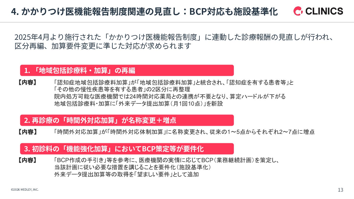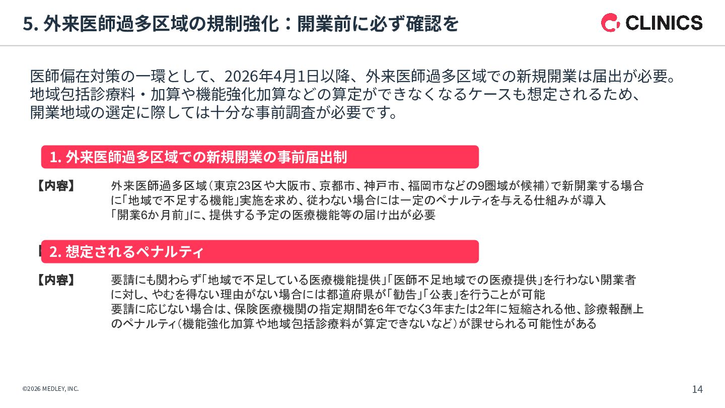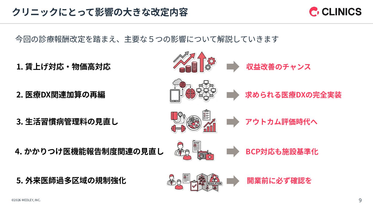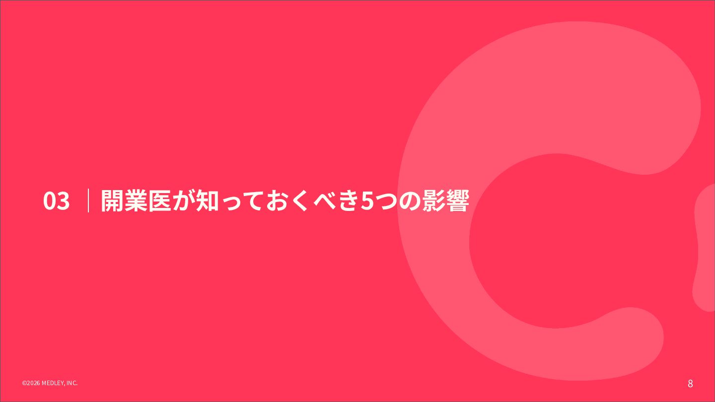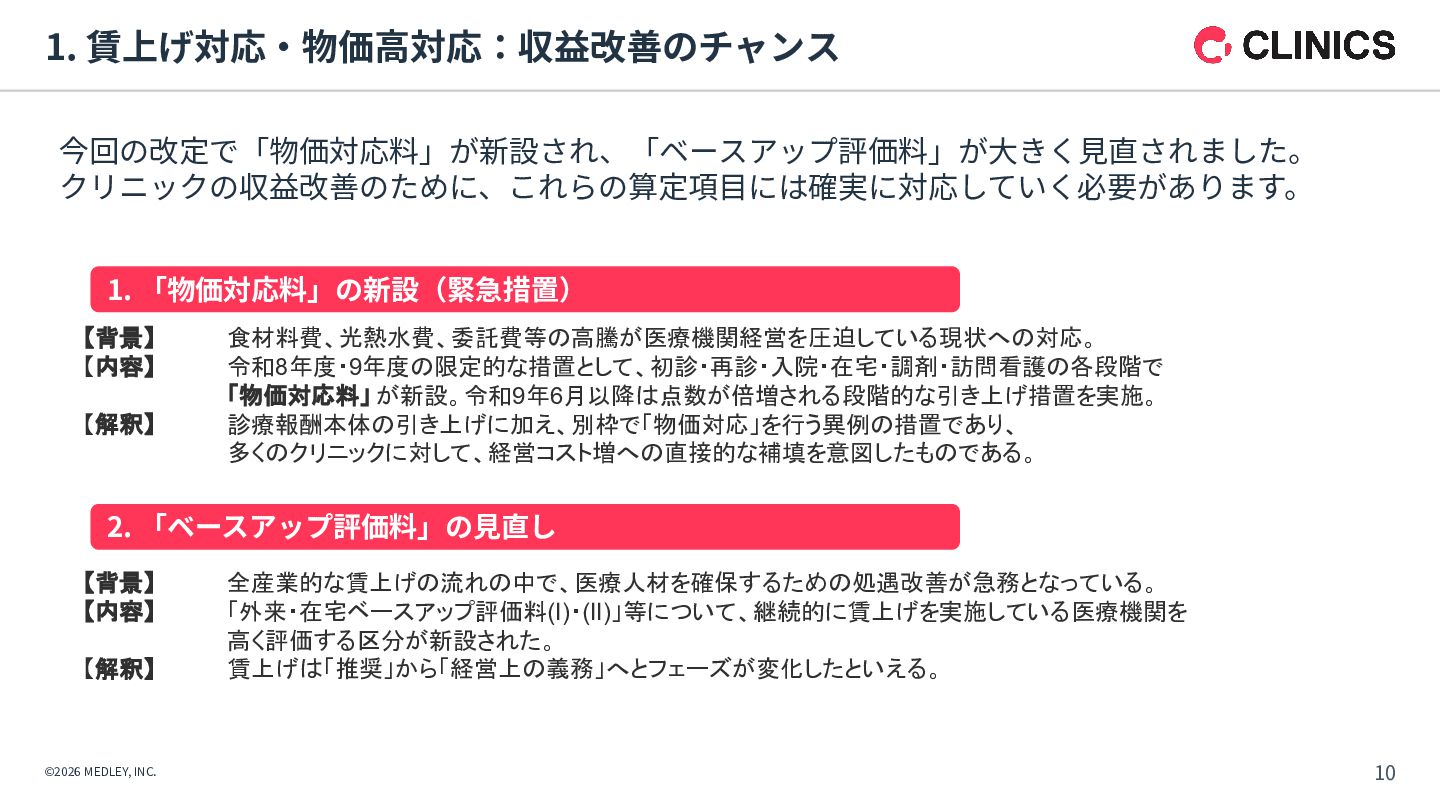 CLINICS 予約 問診 経営分 析 受付 チェック イン レセ チェック 集患 受診導 線 診察 対⾯ オンライン診療 会計 医療DX対応 資格確認/電子処方箋等の連携基盤/ DX加算の算定/制度更新への即応 AI要約アシスト AI⽂書アシスト ITトレンド 2024上半期 電子カルテ部門 No.1 ※1 オンライン診療 導入実績 No.1 ※2 CLINICS 利用医療機関数 約 件 3,500 ※3 ※1出典元: トレンド上半期ランキング2024」(株式会社innovation & Co.、2024年6⽉) ※2出典元:富⼠キメラ総研「ウェアラブル∕ヘルスケアビジネス総調査2024」(2023年実績) ※3 2025年12⽉末時点。オンライン診療と電⼦カルテの合計数