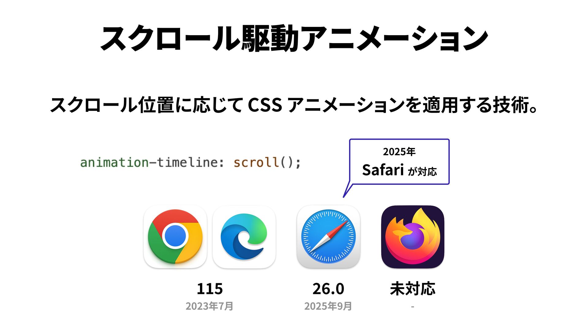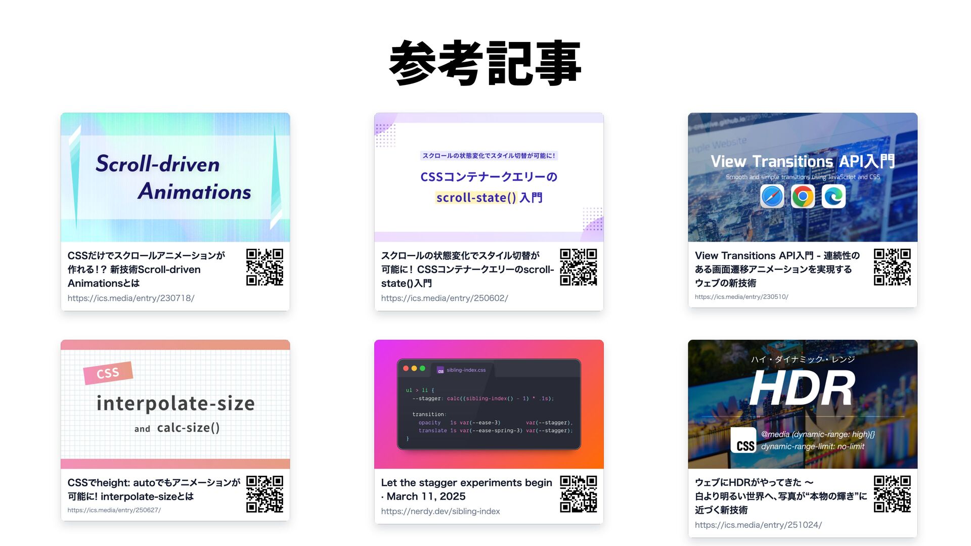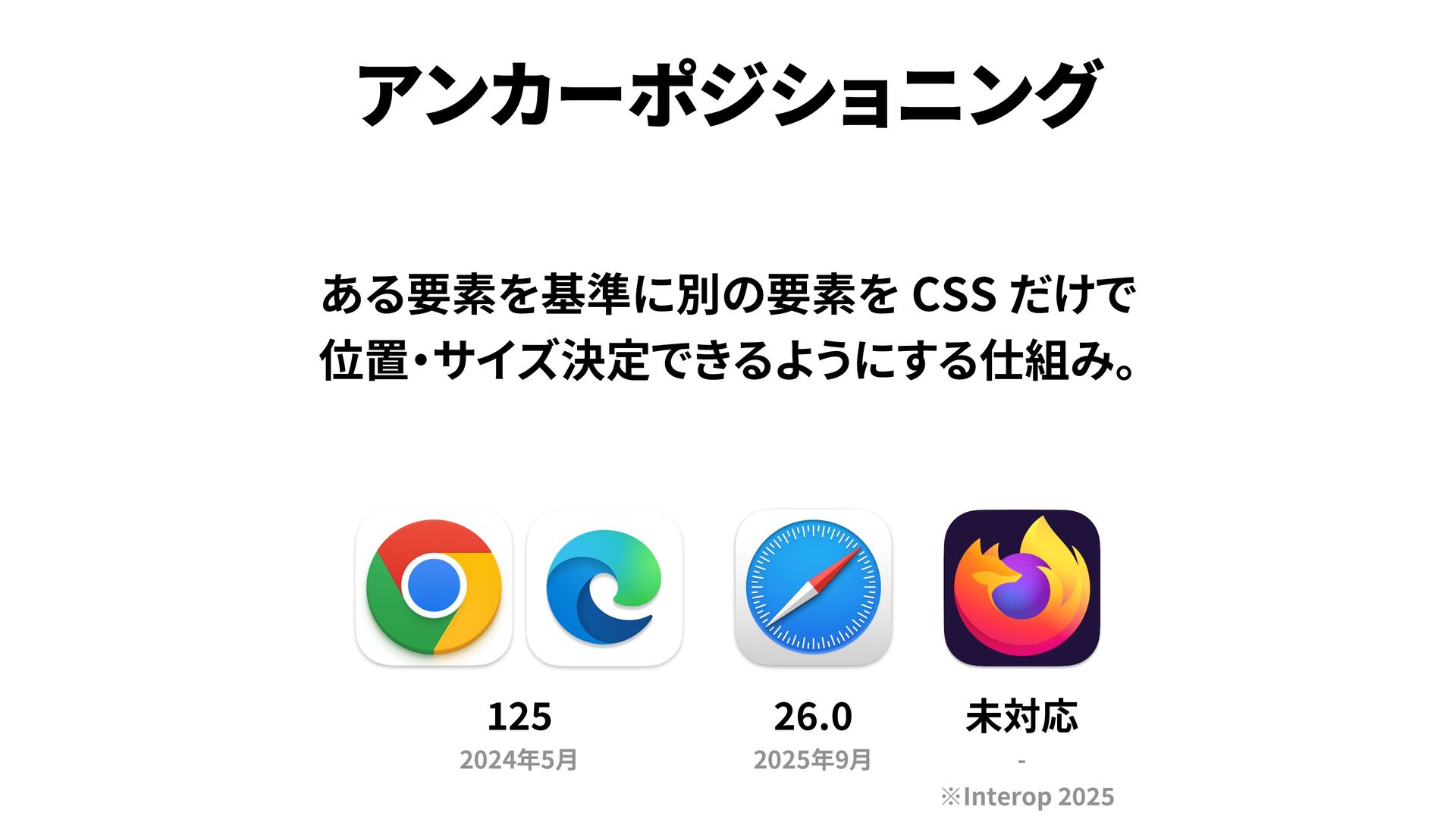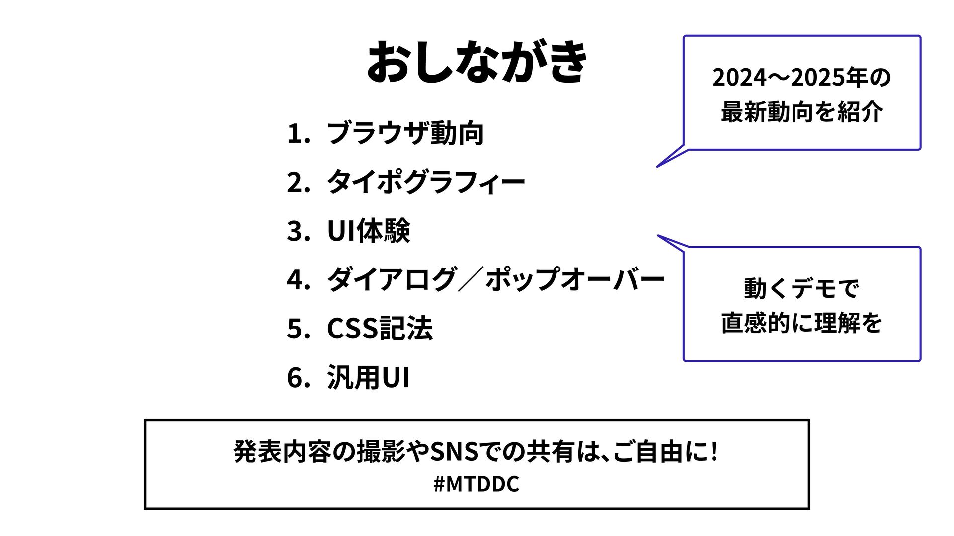 ここ数年、CSSの進化は目覚ましいものがあります。これまでChromeやEdgeが先行していた新機能も、2025年には主要ブラウザで広く実用化され、日常的なUIデザインにも活用できるようになりました。 本セッションでは、ウェブで頻出するUIデザインを題材に、最新のCSSでどのように表現し、どのような点に注意すべきかを実例を交えて紹介します。