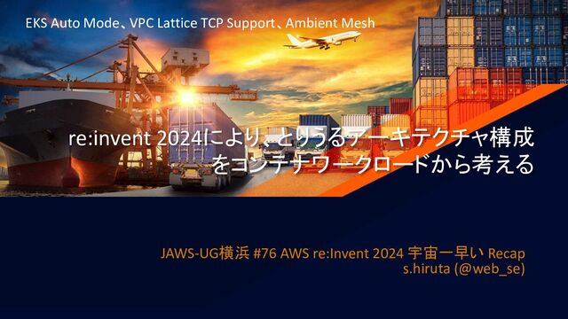 Lattice – https://aws.amazon.com/blogs/networking-and-content-delivery/migrate-amazon-ecs-service-communic ation-to-amazon-vpc-lattice/ • VPC Lattice サービスネットワーク内での SaaS サービス接続 – https://aws.amazon.com/jp/blogs/news/connecting-saas-services-within-a-vpc-lattice-service-network/ • Create cluster with EKS Auto Mode – https://docs.aws.amazon.com/eks/latest/userguide/create-auto.html • [Kubernetes] PodのAZ分散を実現するPod Topology Spread ConstraintsとDescheduler – https://zenn.dev/tmrekk/articles/07f30b09c26b50 • Pod Topology Spread Constraints – https://kubernetes.io/docs/concepts/scheduling-eviction/topology-spread-constraints/ • Transforming Istio into an enterprise-ready service mesh for Amazon ECS – https://aws.amazon.com/blogs/containers/transforming-istio-into-an-enterprise-ready-service-mesh-for-a mazon-ecs/ • しれっと登場したVPC Latticeって何者!? よく分からんから3行で頼む! – https://qiita.com/minorun365/items/7f73aa1fe1ef2ca0c2c7 25