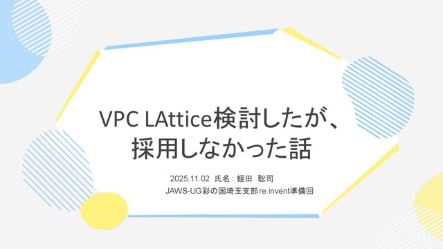 VPC LAttice検討したが、 採用しなかった話 2025.11.02 氏名 : 蛭田 聡司 JAWS-UG彩の国埼玉支部 re:invent準備回