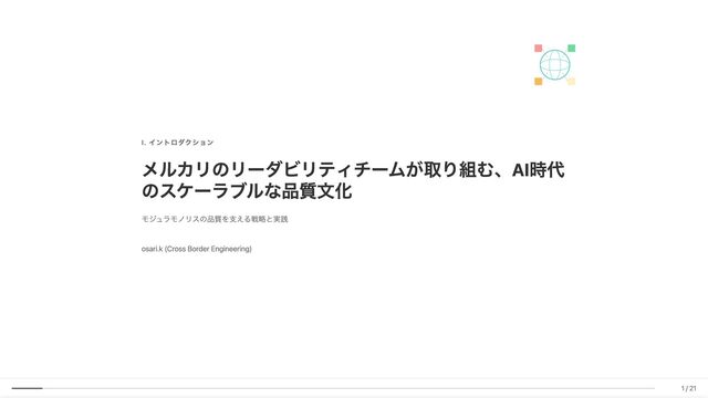 Linter作成が難しい/コストが見合わない場合の対応 具体例: 構造化エラーパッケージの遵守レビュー 古い実装パターンの検知 3. ローカル開発での自己修正ループ コード生成後、Makefileコマンド(lint, test, build等)を自動実行。AI が自らミスを発見し、修正を繰り返す 効果: 人間が介入する前に品質基準を満たしたコードが完成 4. ガイドライン作成にもAI活用 Slackでの議論をもとにAIがDraftを作成。人間は最終調整のみに集中 5. Unit Testの自動生成 Unit testガイドラインを細かくドキュメント化。AIがガイドラインに 従ってテストコードを生成 結果 新人がAIに書かせても、リーダビリティチーム準拠のコードが 出力 スケーラブルな品質管理に近づいてきていると感じています 18 / 21