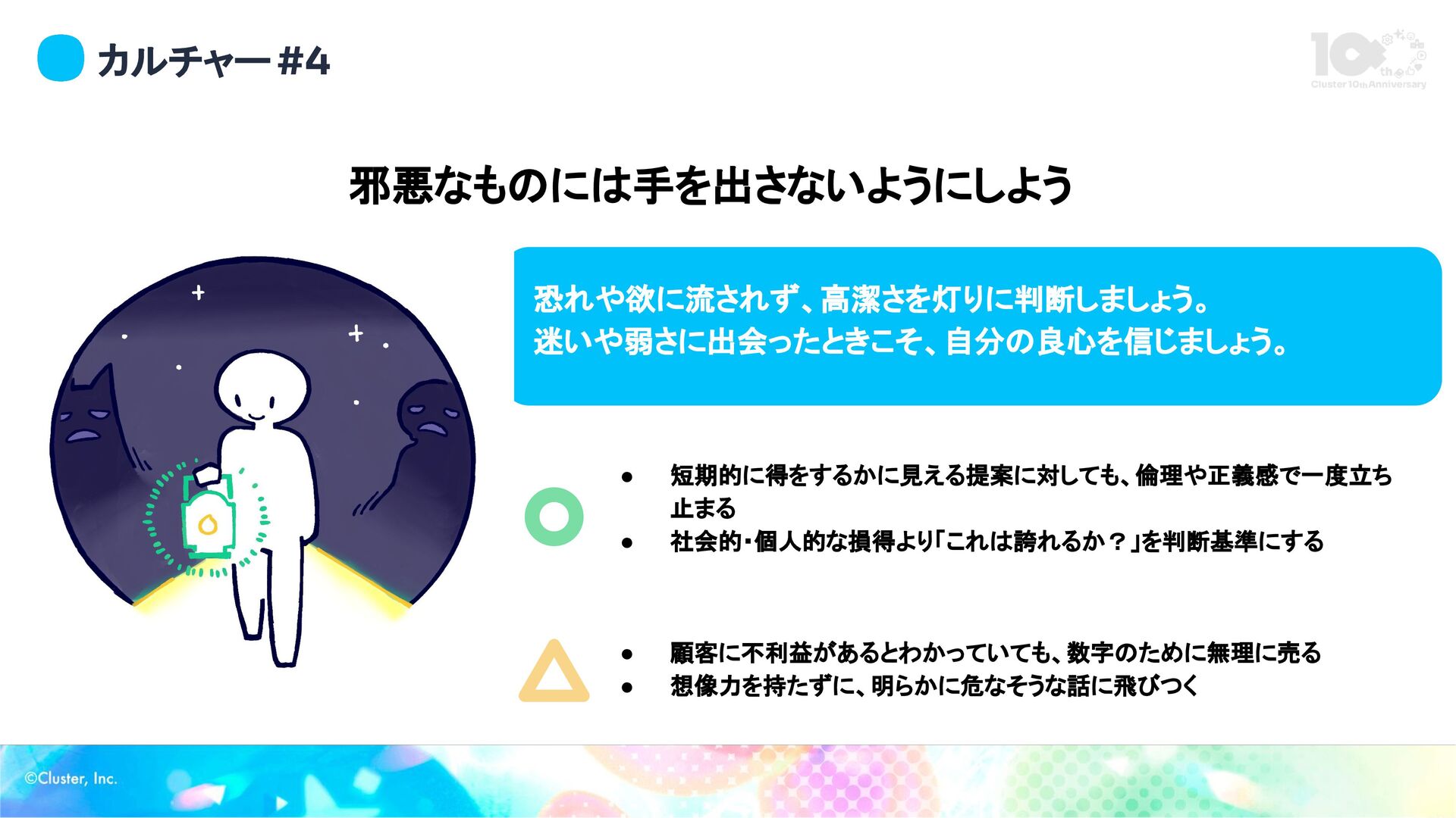 カルチャー #4 邪悪なものには手を出さないようにしよう 恐れや欲に流されず、高潔さを灯りに判断しましょう。 迷いや弱さに出会ったときこそ、自分の良心を信じましょう。 • 短期的に得をするかに見える提案に対しても、倫理や正義感で一度立ち 止まる • 社会的・個人的な損得より「これは誇れるか?」を判断基準にする