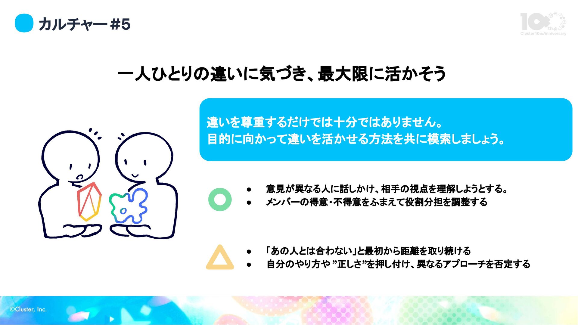 カルチャー #5 一人ひとりの違いに気づき、最大限に活かそう 違いを尊重するだけでは十分ではありません。 目的に向かって違いを活かせる方法を共に模索しましょう。 • 意見が異なる人に話しかけ、相手の視点を理解しようとする。 • メンバーの得意・不得意をふまえて役割分担を調整する •