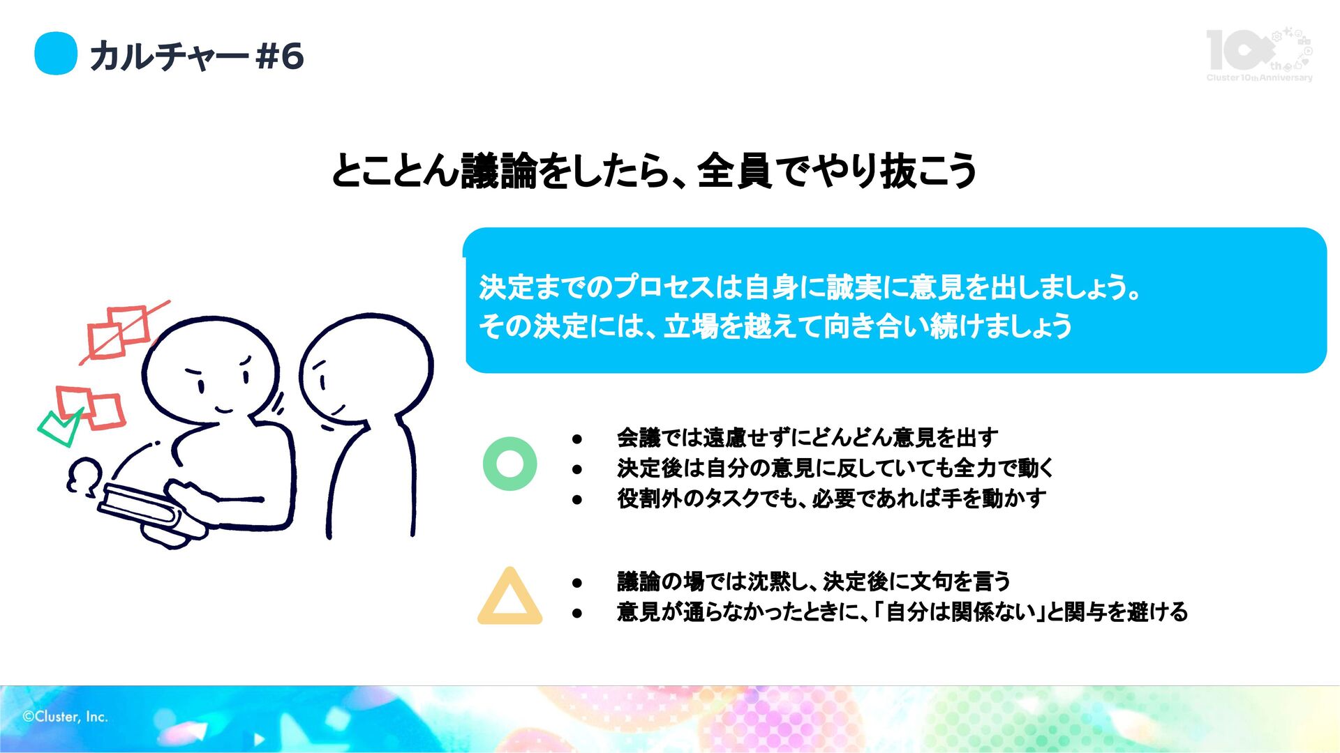 カルチャー #6 とことん議論をしたら、全員でやり抜こう 決定までのプロセスは自身に誠実に意見を出しましょう。 その決定には、立場を越えて向き合い続けましょう • 会議では遠慮せずにどんどん意見を出す • 決定後は自分の意見に反していても全力で動く •