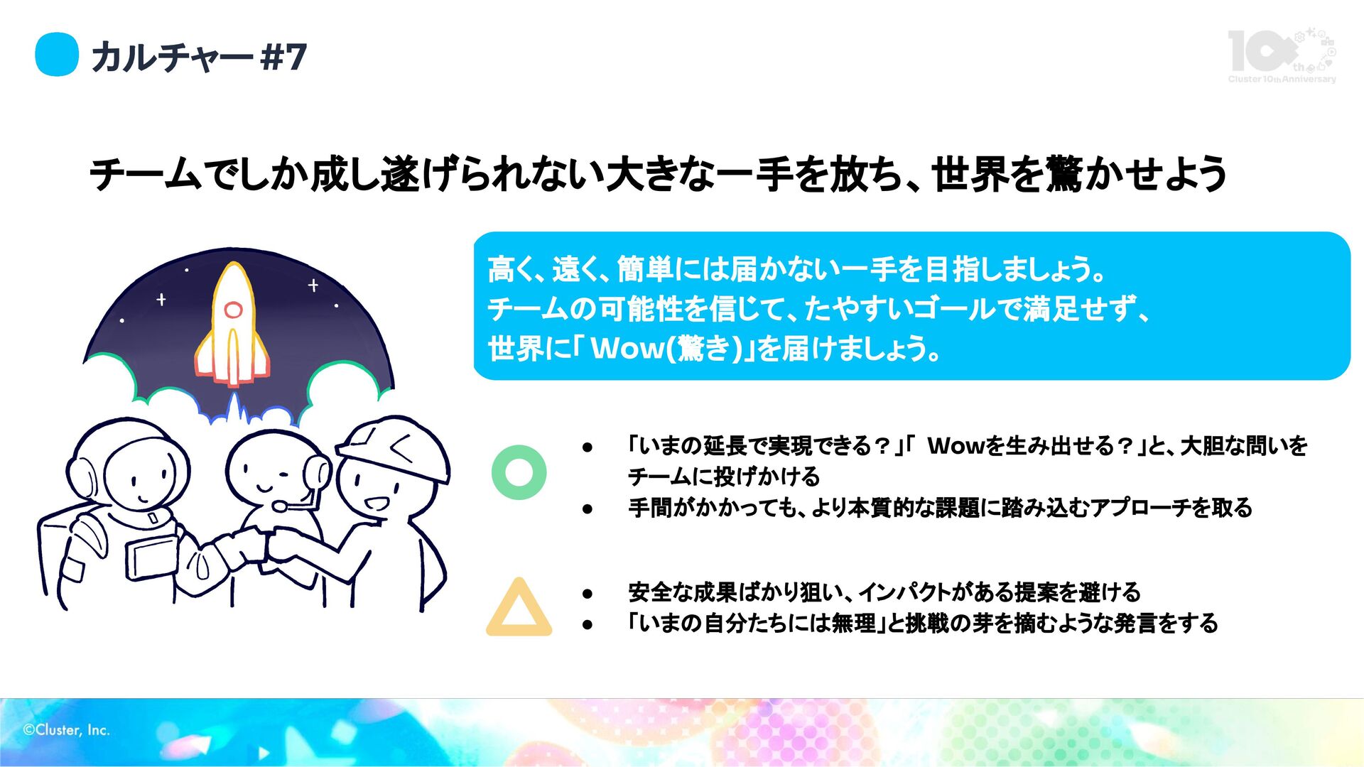カルチャー #7 チームでしか成し遂げられない大きな一手を放ち、世界を驚かせよう 高く、遠く、簡単には届かない一手を目指しましょう。 チームの可能性を信じて、たやすいゴールで満足せず、 世界に「Wow(驚き)」を届けましょう。 • 「いまの延長で実現できる?」「 Wowを生み出せる?」と、大胆な問いを チームに投げかける