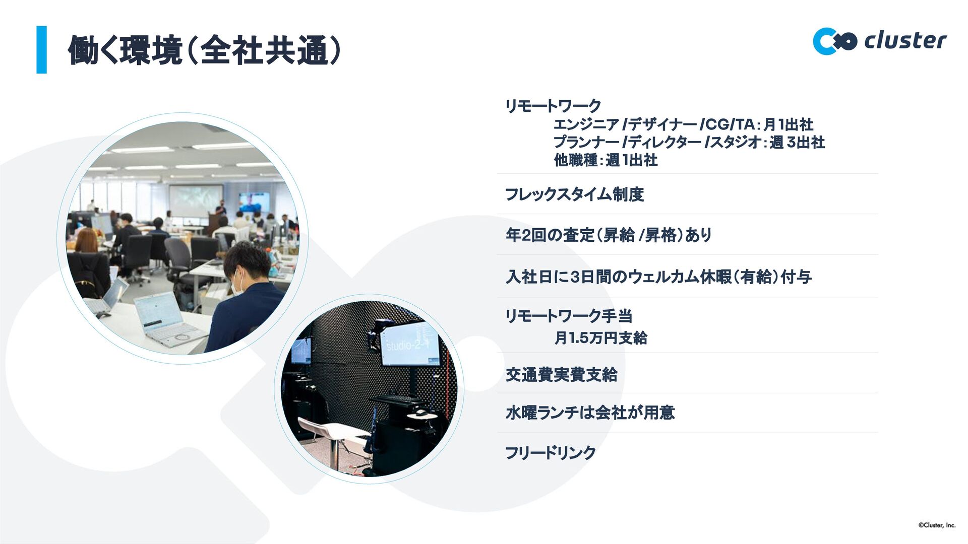 1出社 フレックスタイム制度 年2回の査定(昇給 /昇格)あり 入社日に3日間のウェルカム休暇(有給)付与 リモートワーク手当 交通費実費支給 水曜ランチは会社が用意 月1.5万円支給 フリードリンク