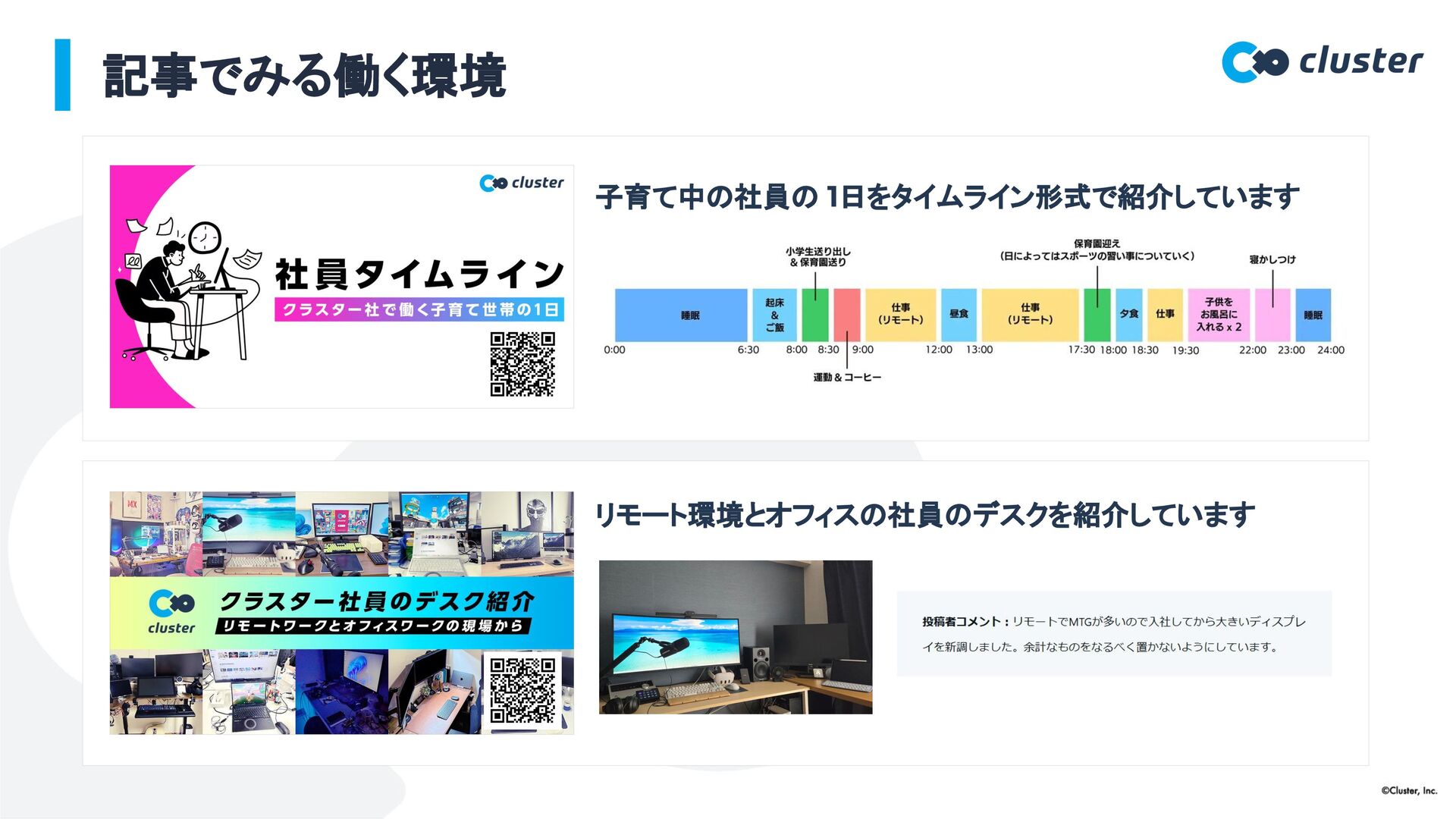 記事でみる働く環境 子育て中の社員の 1日をタイムライン形式で紹介しています リモート環境とオフィスの社員のデスクを紹介しています