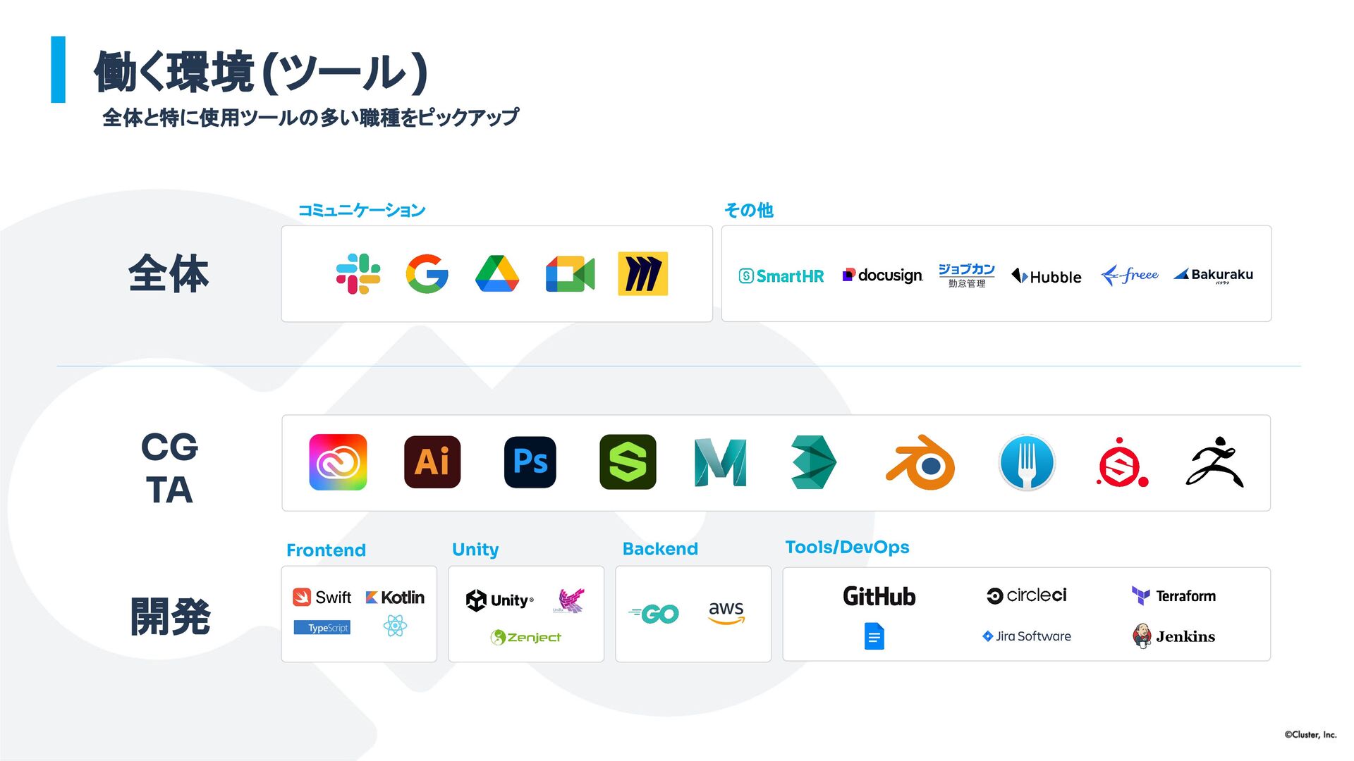 働く環境(ツール) CG TA 開発 全体 Frontend Tools/DevOps Unity Backend コミュニケーション