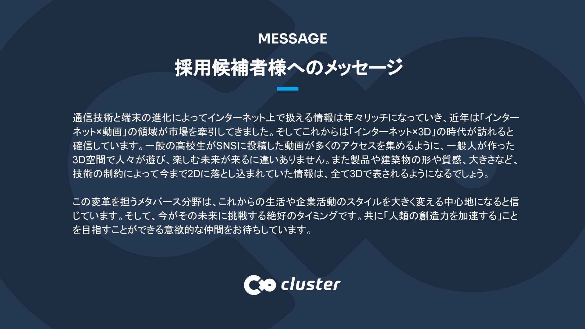 採用候補者様へのメッセージ MESSAGE 通信技術と端末の進化によってインターネット上で扱える情報は年々リッチになっていき、近年は「インター ネット×動画」の領域が市場を牽引してきました。そしてこれからは「インターネット×3D」の時代が訪れると 確信しています。一般の高校生がSNSに投稿した動画が多くのアクセスを集めるように、一般人が作った 3D空間で人々が遊び、楽しむ未来が来るに違いありません。また製品や建築物の形や質感、大きさなど、 技術の制約によって今まで2Dに落とし込まれていた情報は、全て3Dで表されるようになるでしょう。 この変革を担うメタバース分野は、これからの生活や企業活動のスタイルを大きく変える中心地になると信 じています。そして、今がその未来に挑戦する絶好のタイミングです。共に「人類の創造力を加速する」こと を目指すことができる意欲的な仲間をお待ちしています。