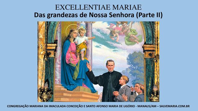 Ligório – MANAUS/AM salvemaria.com.br Excellentiae Mariae – Das grandezas de Nossa Senhora – Parte II 1) Imitação da Santíssima Virgem (cont.) ➢ Em honra ao seu Divino Filho, era preciso que suas virtudes não fossem apenas as ordinárias. “Do mesmo modo que, na criação do mundo, Deus reuniu no homem todas as maravilhas do universo, assim, na regeneração do mundo, reuniu em Maria a perfeição de toda a Igreja e a de todos os santos. Tudo o que há de mais notável num santo, achá- lo-eis em Maria; nela a paciência de Jó, a brandura de Moisés, a fé do profeta Abraão, a castidade de José, a humildade de Davi, a sabedoria de Salomão, o zelo de Elias, a pureza das virgens, a força dos mártires, a piedade dos confessores, a ciência dos Doutores, o desapego dos anacoretas pelos bens da terra.” (S. Tomás de Vilanova).