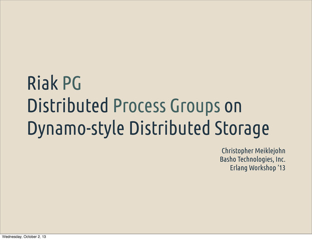 Group, Pid}, _Sender, #state{groups=Groups0, partition=Partition}=State) -> %% Find existing list of Pids, and add object to it. Pids0 = pids(Groups0, Group, riak_dt_vvorset:new()), Pids = riak_dt_vvorset:update({add, Pid}, Partition, Pids0), %% Store back into the dict. Groups = dict:store(Group, Pids, Groups0), %% Return updated groups. {reply, {ok, ReqId}, State#state{groups=Groups}}; %% @doc Return pids from the dict. -spec pids(dict(), atom(), term()) -> term(). pids(Groups, Group, Default) -> case dict:find(Group, Groups) of {ok, Object} -> Object; _ -> Default end. riak_pg/src/riak_pg_memberships_vnode.erl Wednesday, October 2, 13