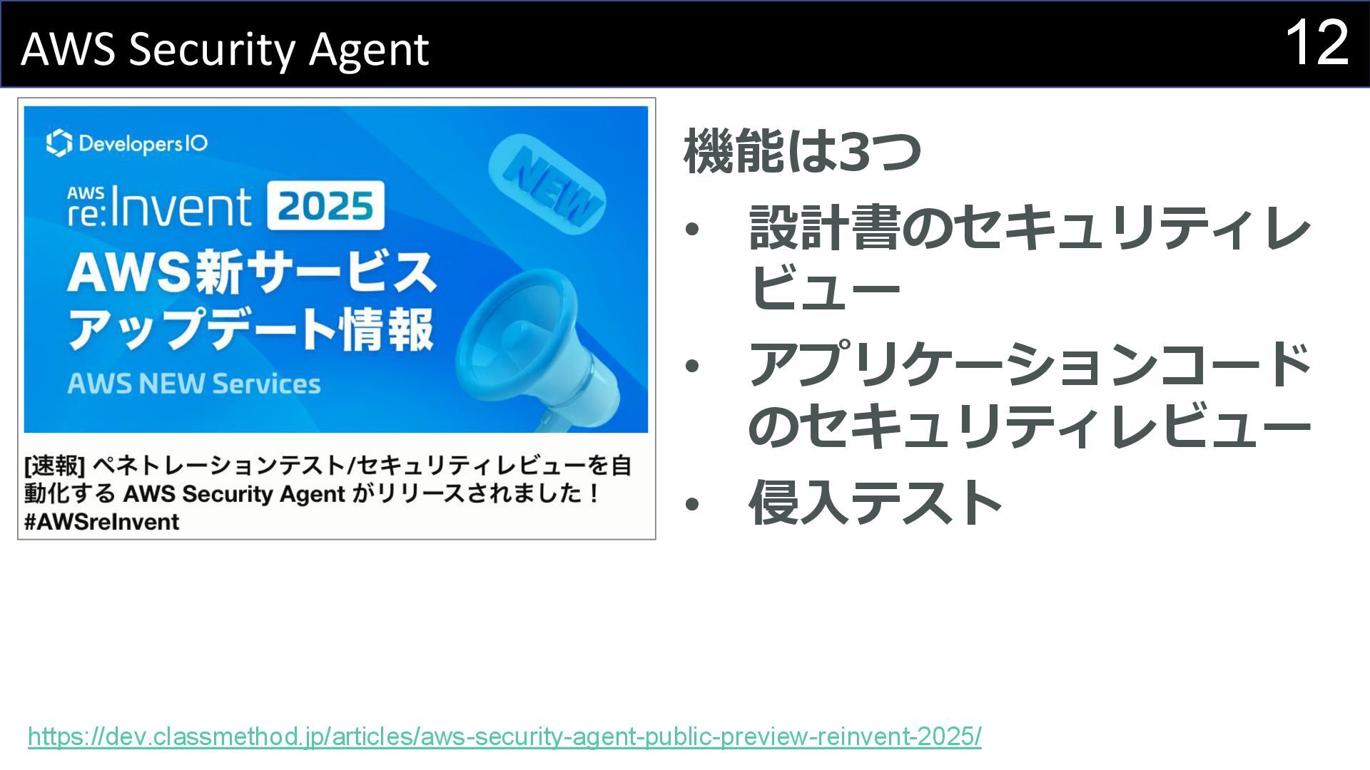 のセキュリティレビュー • 侵入テスト https://dev.classmethod.jp/articles/aws-security-agent-public-preview-reinvent-2025/