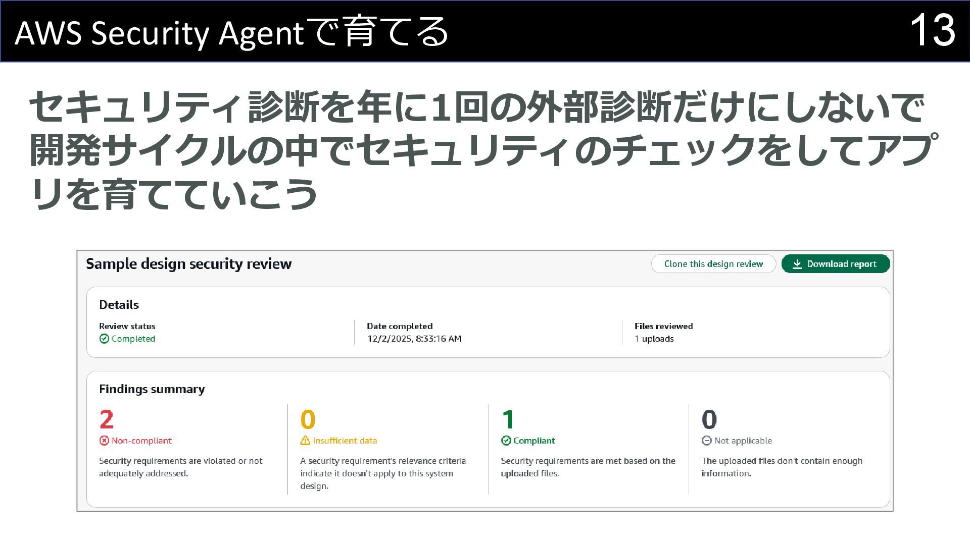 13 AWS Security Agentで育てる セキュリティ診断を年に1回の外部診断だけにしないで 開発サイクルの中でセキュリティのチェックをしてアプ リを育てていこう