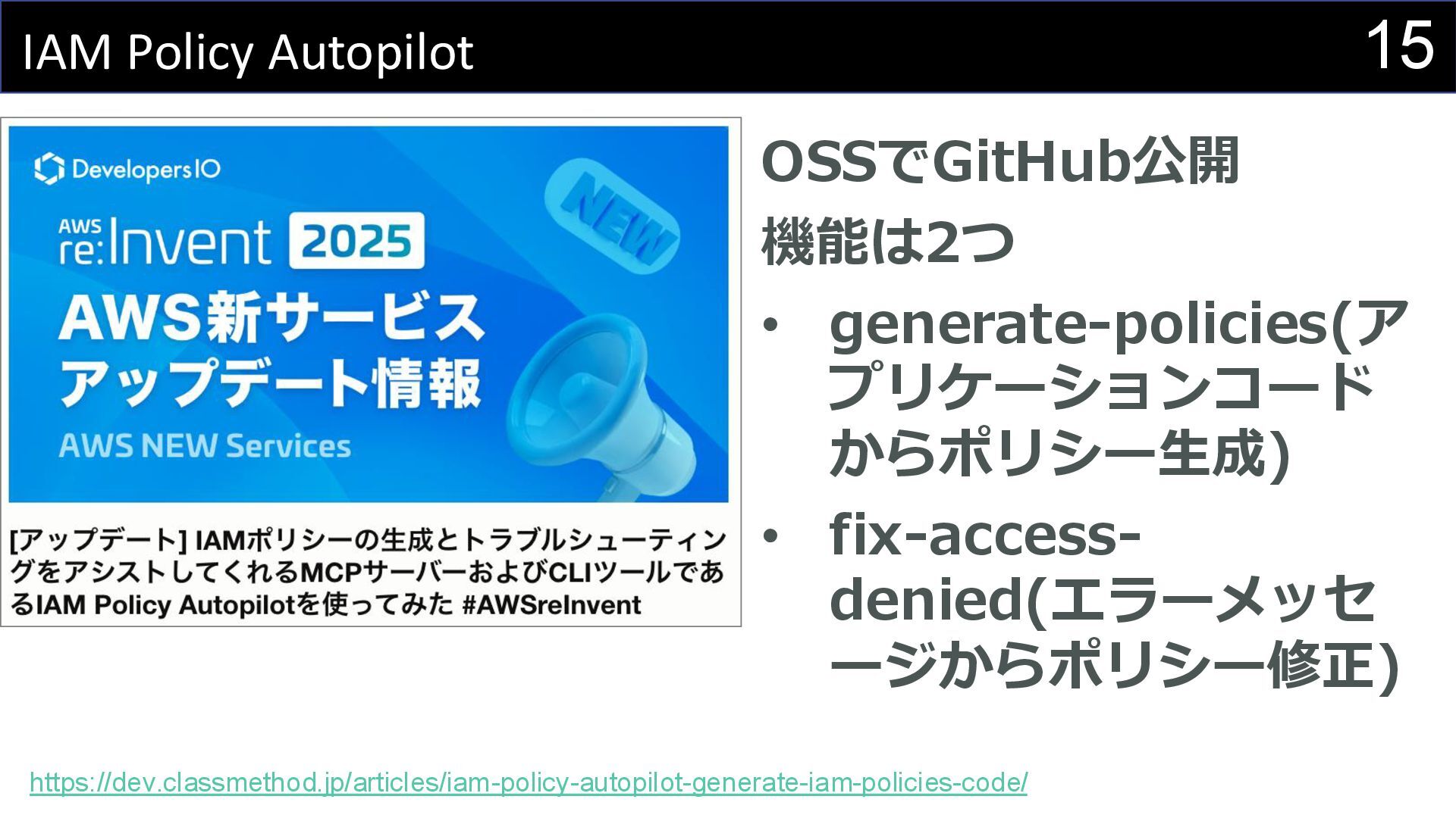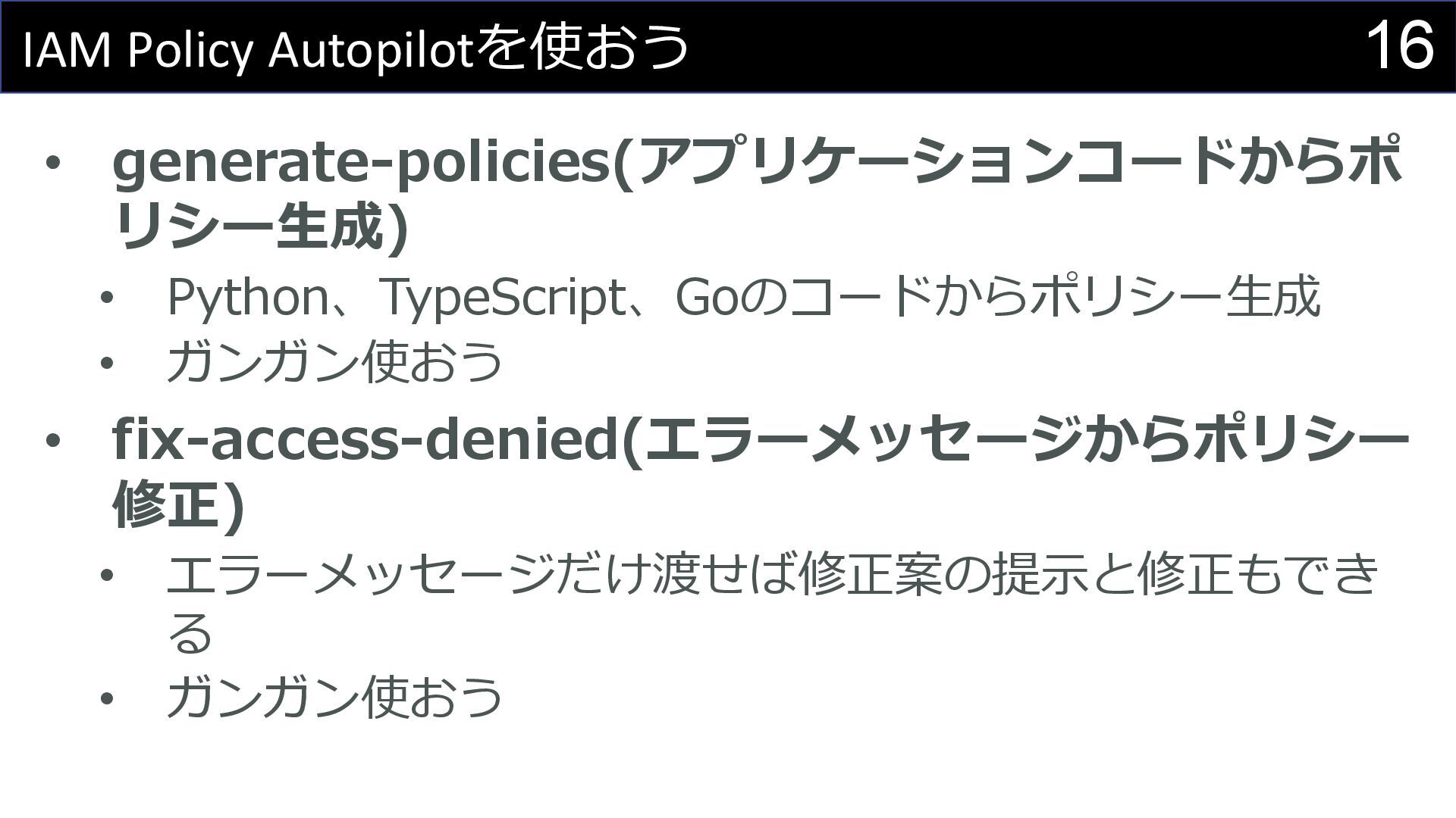 • fix-access- denied(エラーメッセ ージからポリシー修正) https://dev.classmethod.jp/articles/iam-policy-autopilot-generate-iam-policies-code/