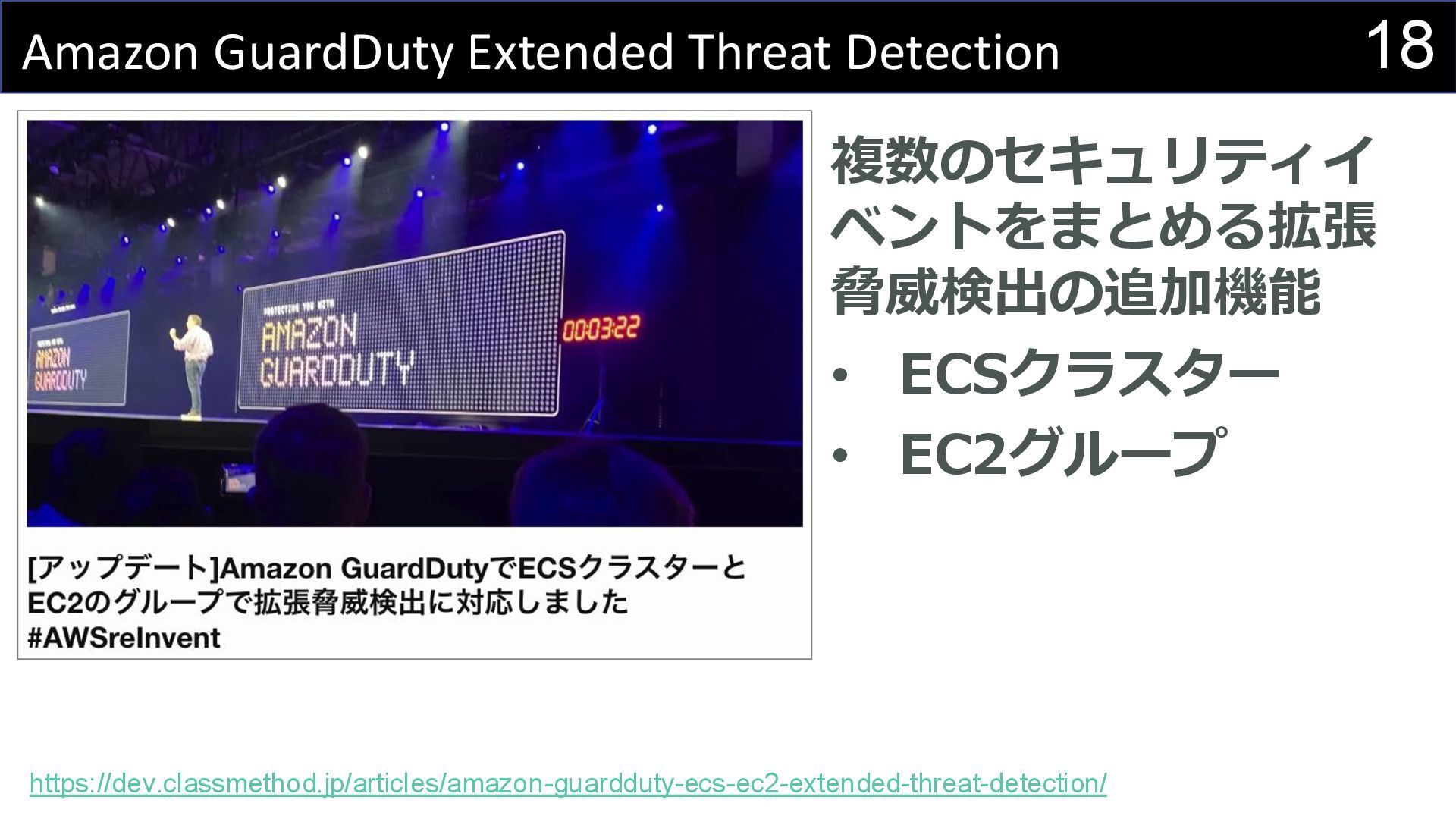 • Amazon GuardDuty Extended Threat Detectionリリース • AWS Security Hubリリース(リアルタイム分析・ リスク優先順位付け)