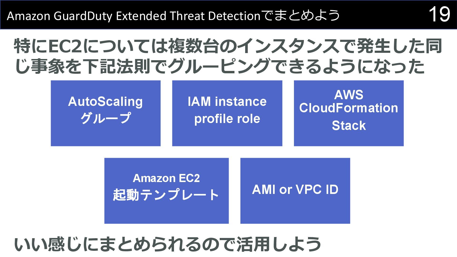 19 Amazon GuardDuty Extended Threat Detectionでまとめよう 特にEC2については複数台のインスタンスで発生した同 じ事象を下記法則でグルーピングできるようになった いい感じにまとめられるので活用しよう AutoScaling