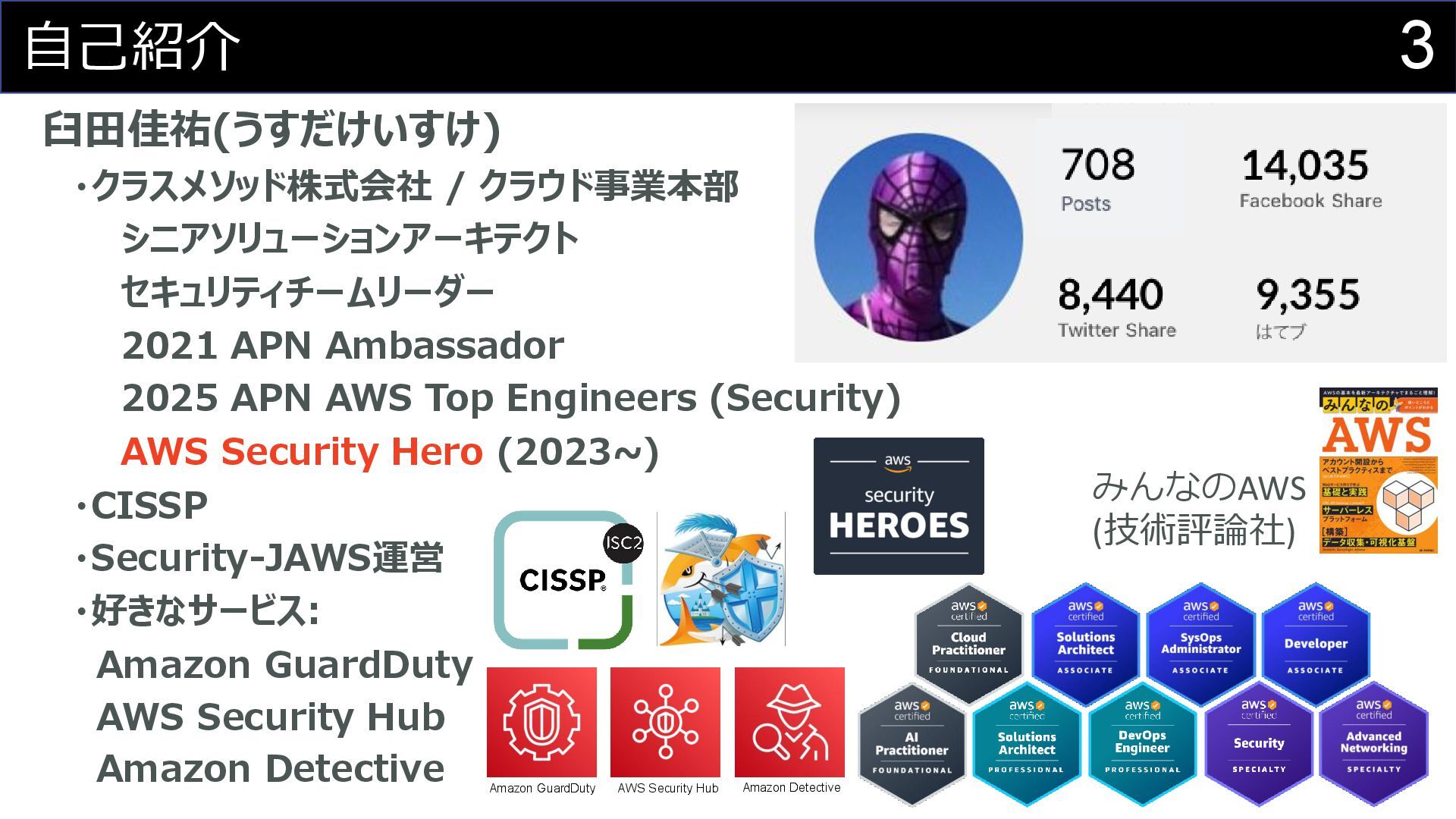 Ambassador 2025 APN AWS Top Engineers (Security) AWS Security Hero (2023~) ・CISSP ・Security-JAWS運営 ・好きなサービス: Amazon GuardDuty AWS Security Hub Amazon Detective みんなのAWS (技術評論社) Amazon GuardDuty AWS Security Hub Amazon Detective