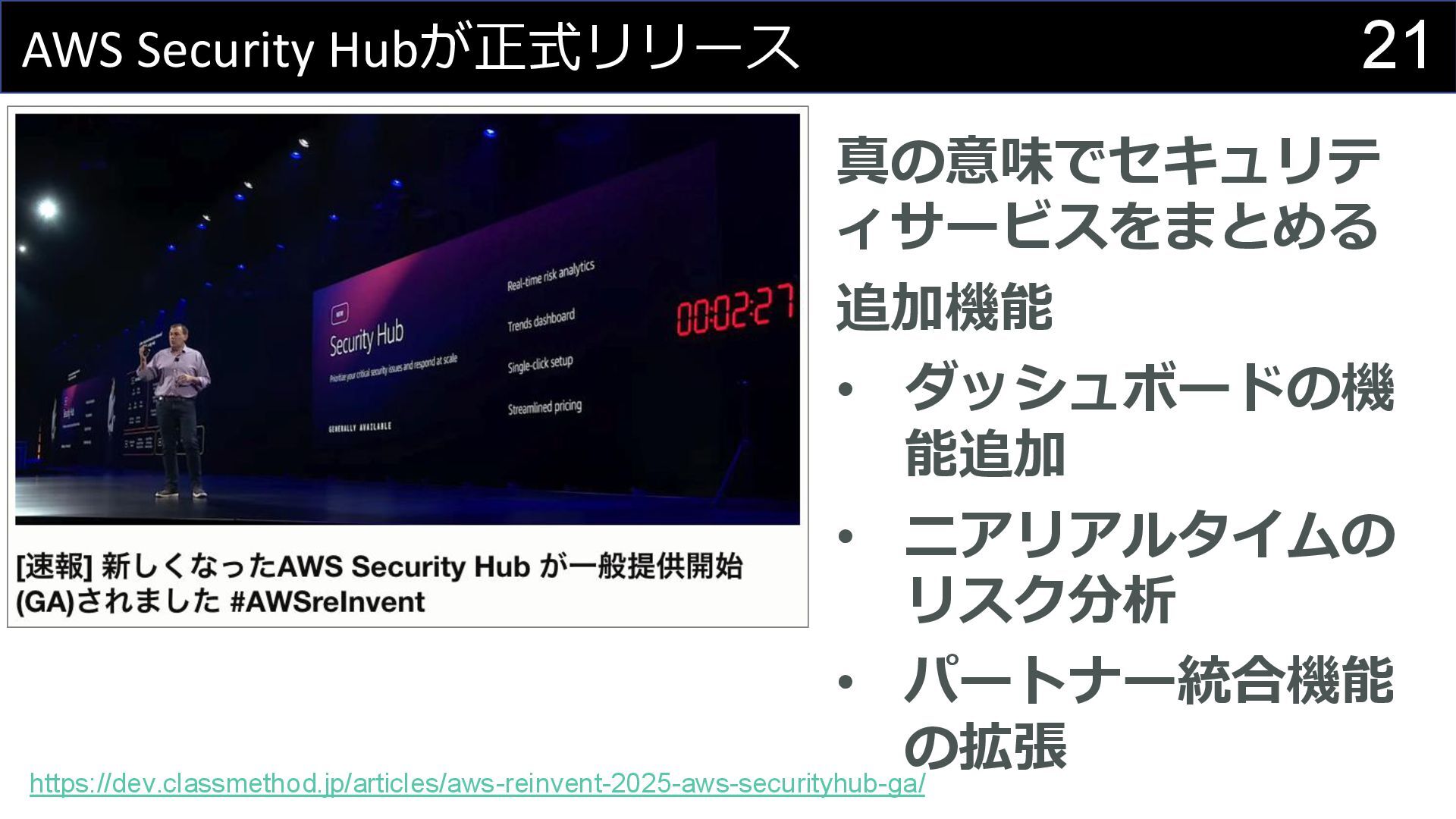 • ニアリアルタイムの リスク分析 • パートナー統合機能 の拡張 https://dev.classmethod.jp/articles/aws-reinvent-2025-aws-securityhub-ga/