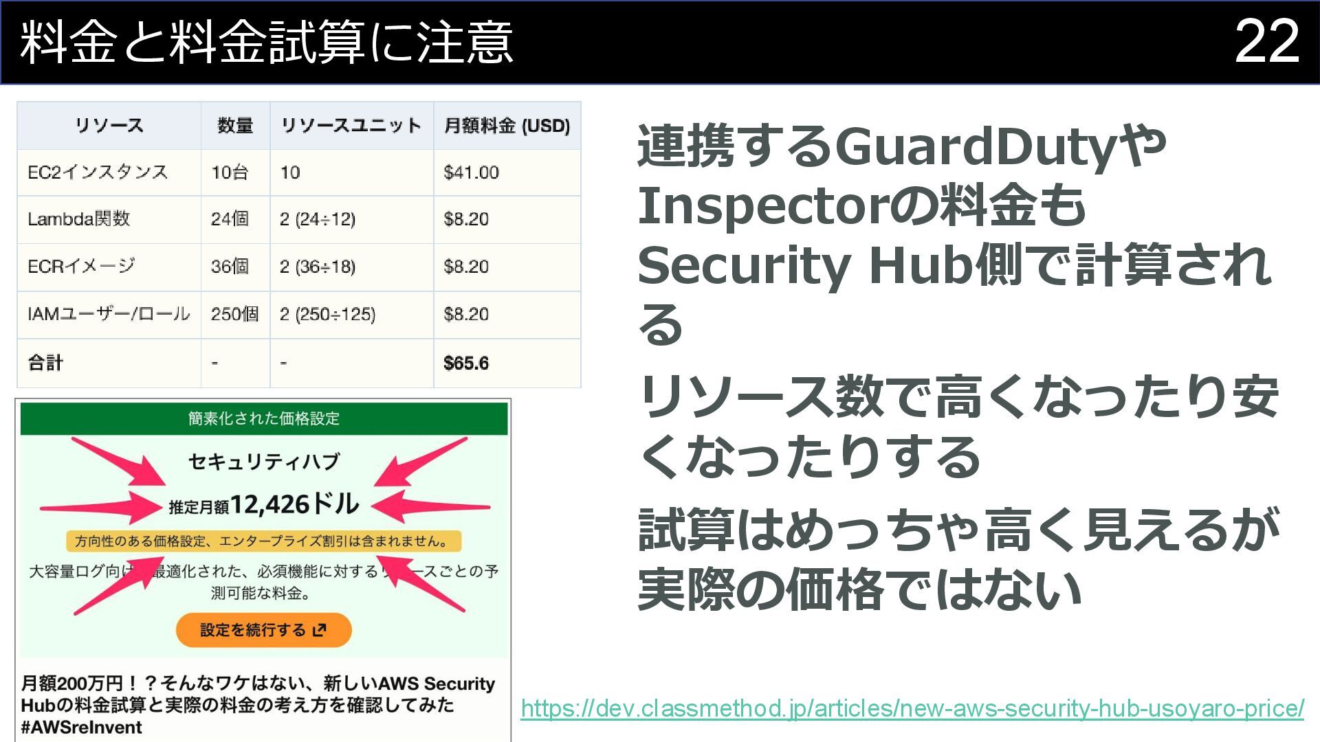22 料金と料金試算に注意 連携するGuardDutyや Inspectorの料金も Security Hub側で計算され る リソース数で高くなったり安 くなったりする 試算はめっちゃ高く見えるが