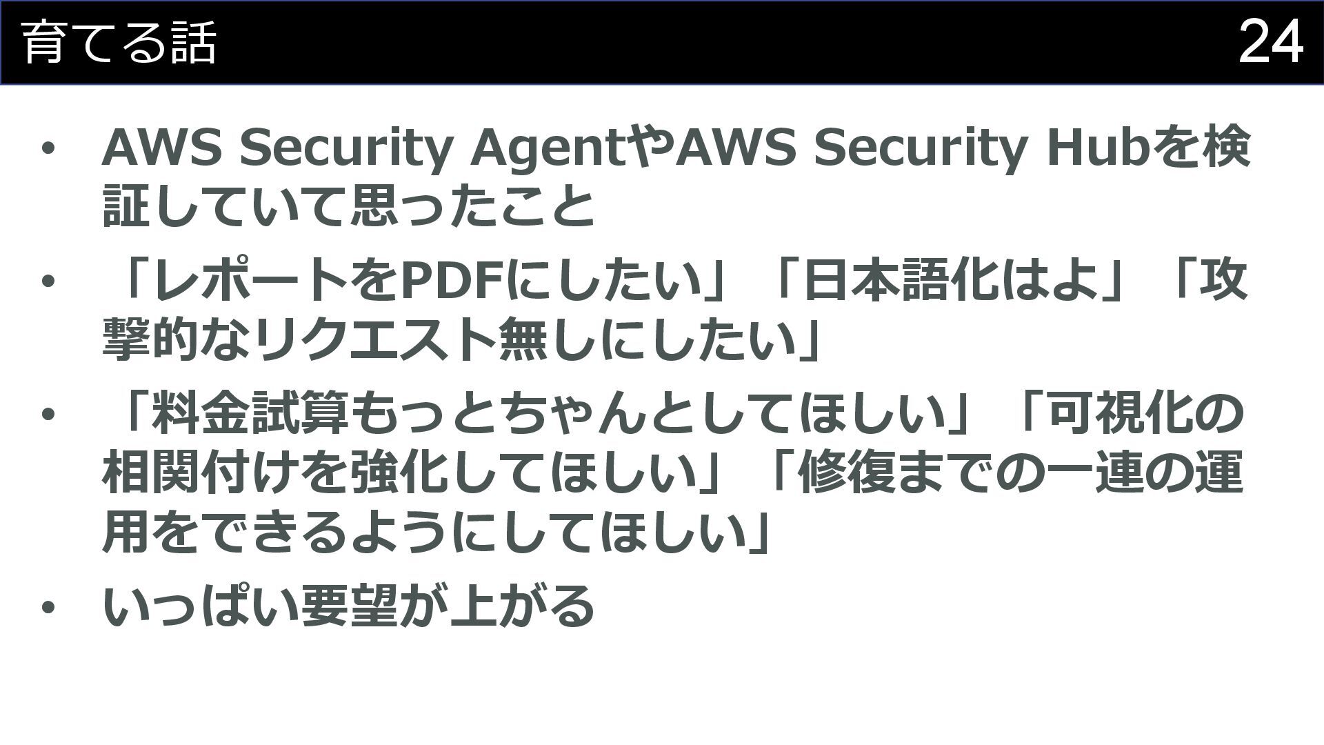 24 育てる話 • AWS Security AgentやAWS Security Hubを検 証していて思ったこと •