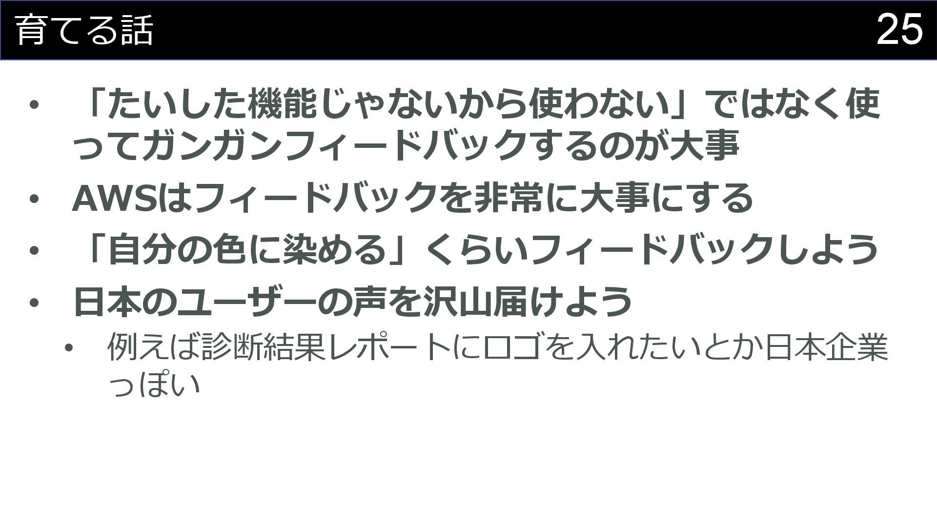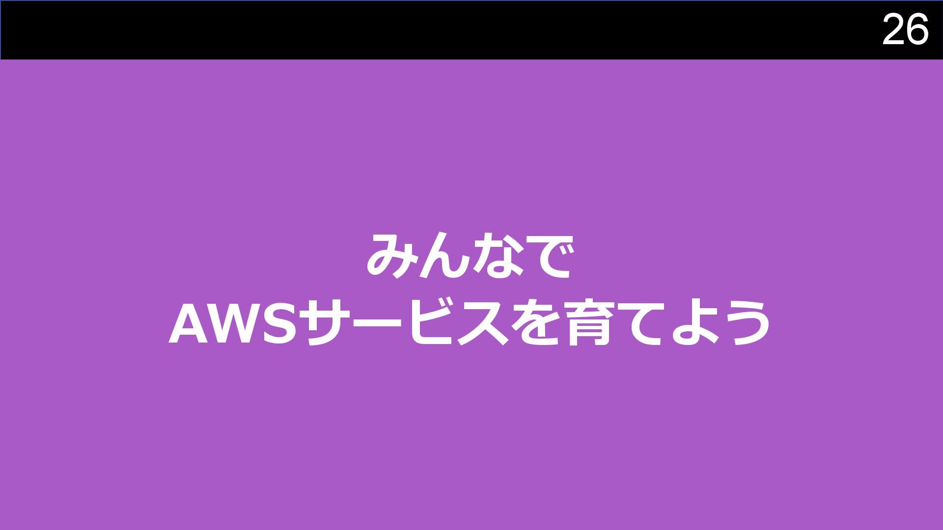 25 育てる話 • 「たいした機能じゃないから使わない」ではなく使 ってガンガンフィードバックするのが大事 • AWSはフィードバックを非常に大事にする • 「自分の色に染める」くらいフィードバックしよう •