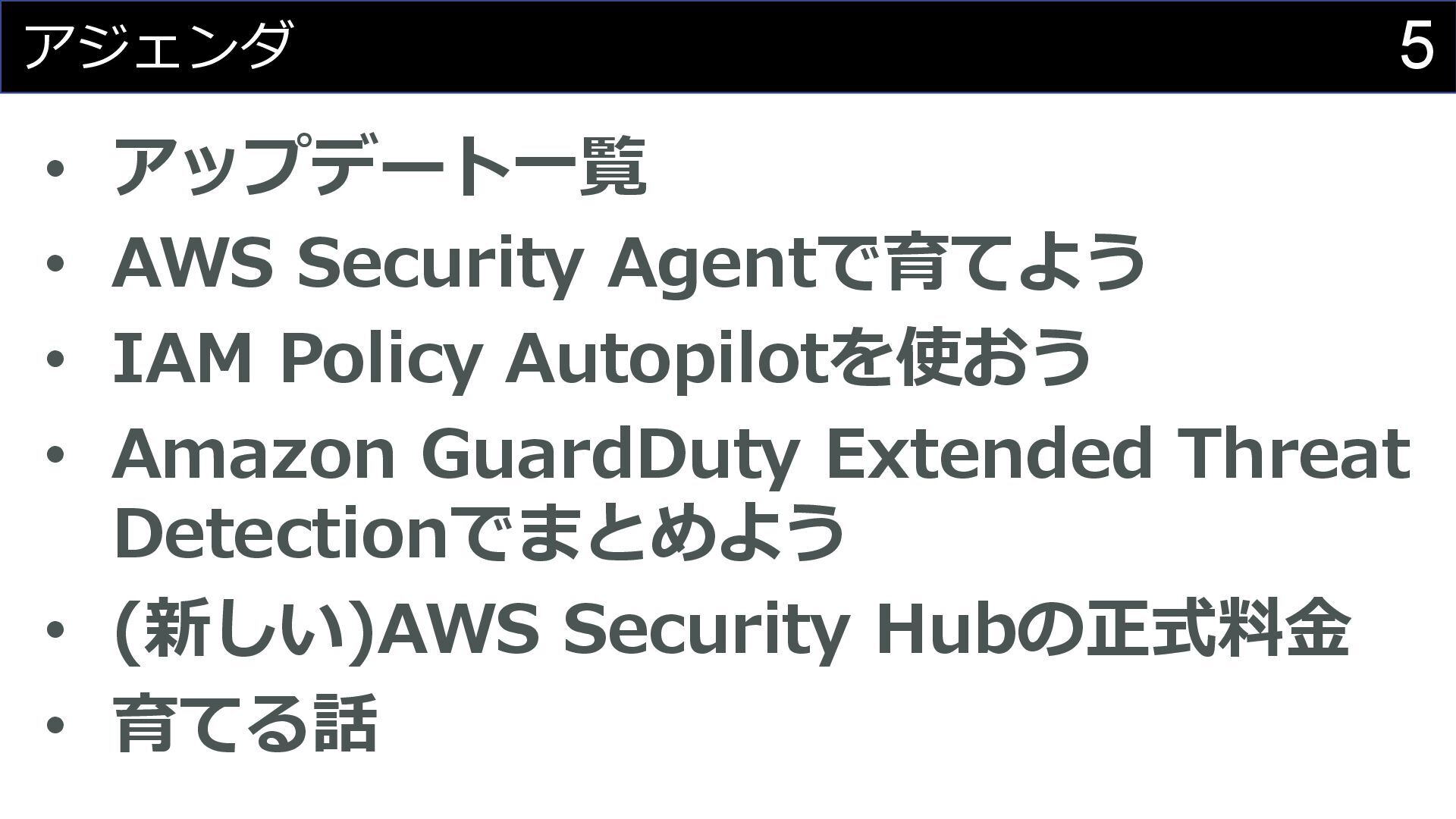 5 アジェンダ • アップデート一覧 • AWS Security Agentで育てよう • IAM