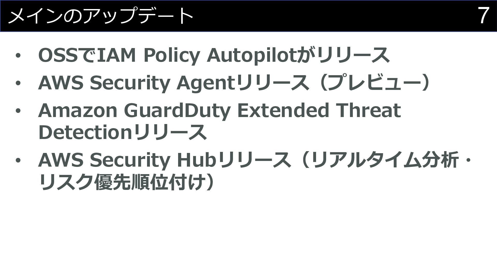7 メインのアップデート • OSSでIAM Policy Autopilotがリリース • AWS Security Agentリリース(プレビュー)