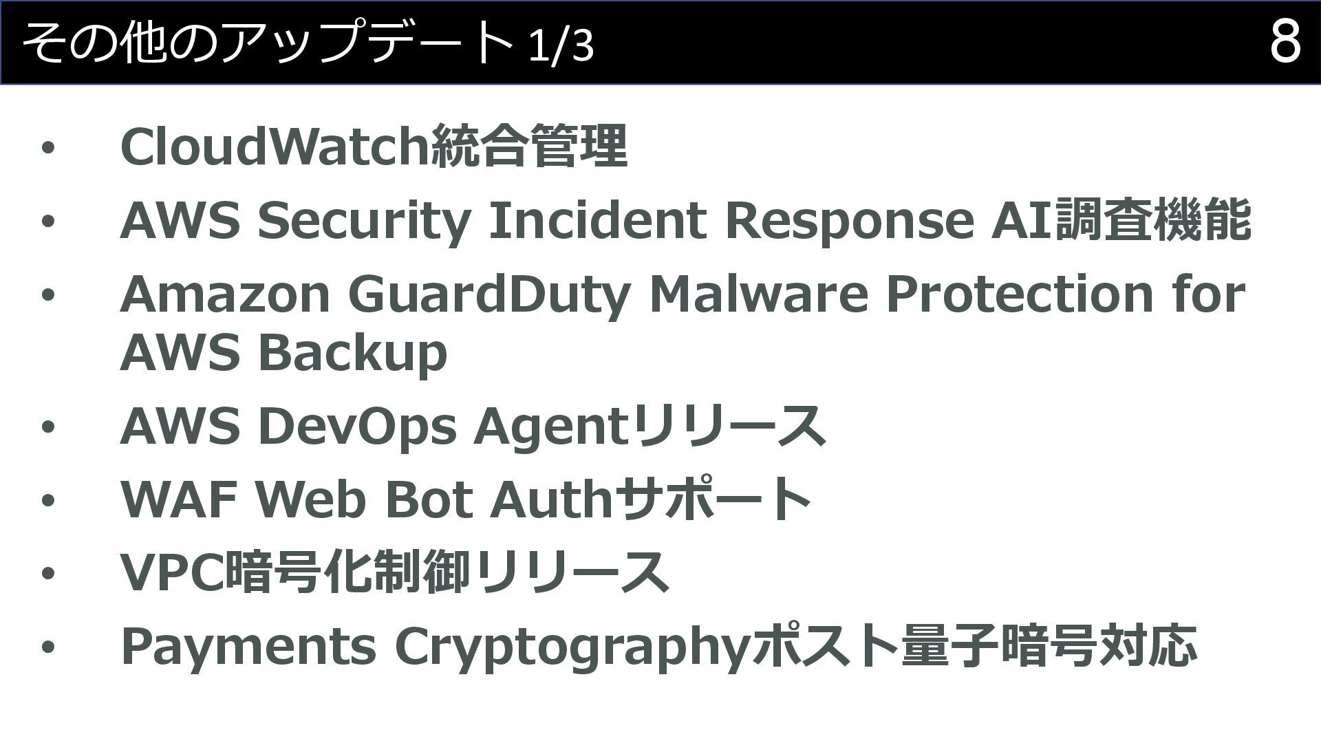 AI調査機能 • Amazon GuardDuty Malware Protection for AWS Backup • AWS DevOps Agentリリース • WAF Web Bot Authサポート • VPC暗号化制御リリース • Payments Cryptographyポスト量子暗号対応