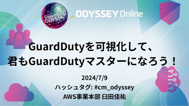 GuardDutyを可視化して、 君もGuardDutyマスターになろう! 2024/7/9 ハッシュタグ: #cm_odyssey AWS事業本部 ⾅⽥佳祐