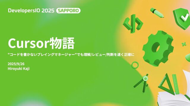 2025年9月26日、DeveloperIO Sapporo 2025にて「Cursor物語 - "コードを書かないプレイングマネージャー"でも、理解/レビュー/判断を速く、正確に。」というタイトルで10分間のライトニングトーク(LT)を発表させていただきました。 非開発者の視点から、AIエディタ「Cursor」を活用した業務効率化の実践事例を共有しました。