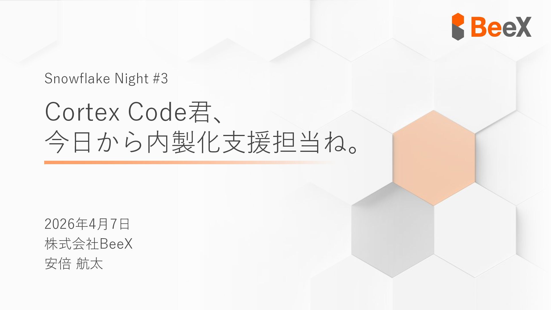今日から内製化支援担当ね。 Snowflake Night #3 2026年4月7日 株式会社BeeX 安倍 航太