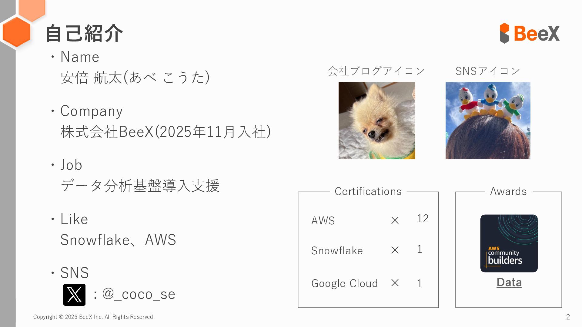安倍 航太(あべ こうた) ・Company 株式会社BeeX(2025年11月入社) ・Job データ分析基盤導入支援 ・Like Snowflake、AWS ・SNS : @_coco_se 自己紹介 会社ブログアイコン SNSアイコン Data Certifications AWS Snowflake Google Cloud × × × 12 1 1 Awards