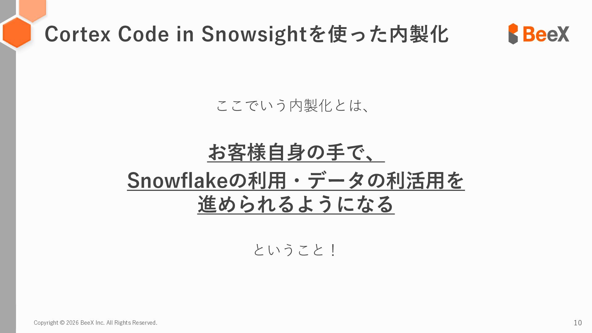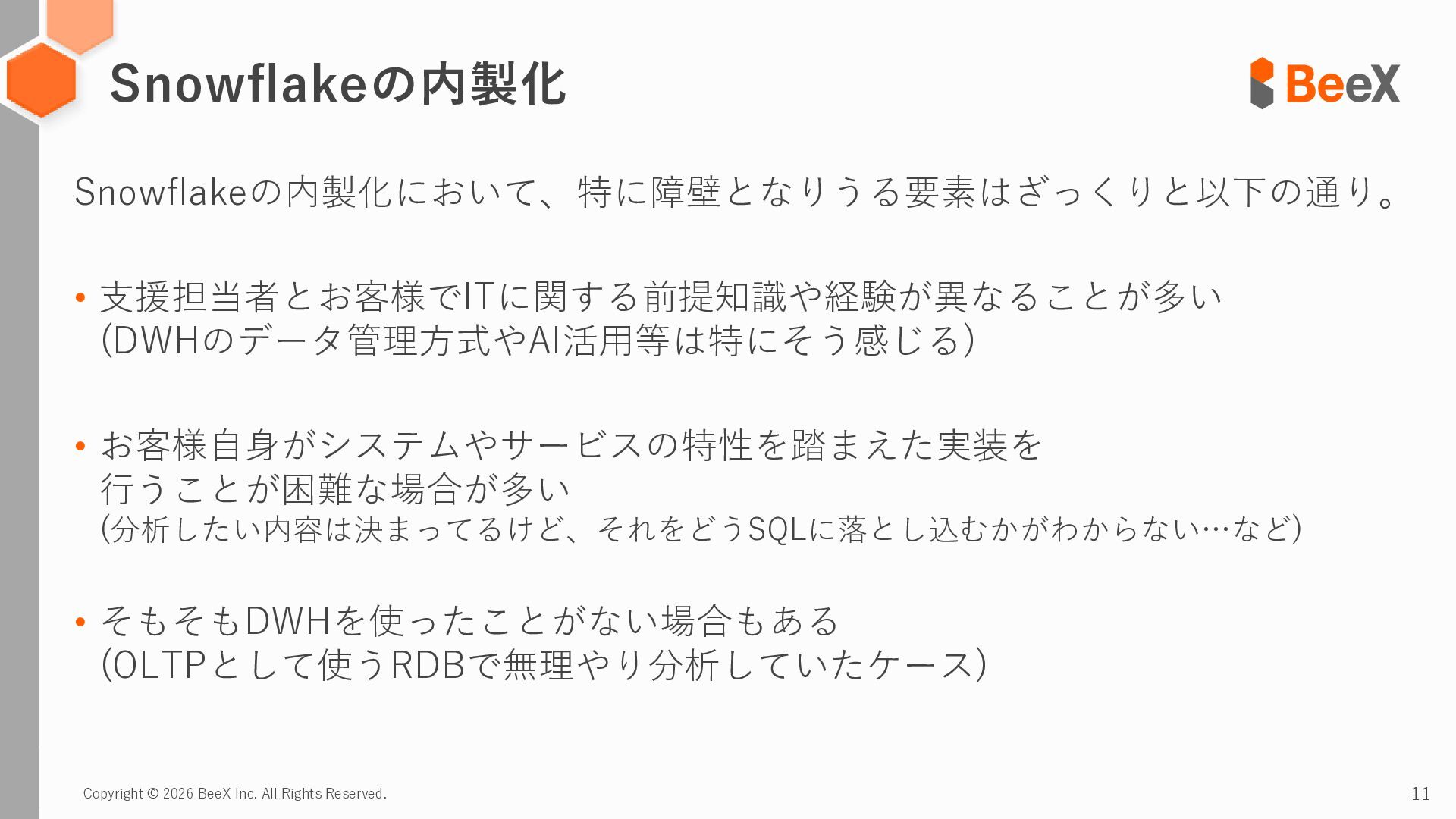 11. Copyright © 2026 BeeX Inc. All Rights Reserved. 11 Snowflakeの内製化