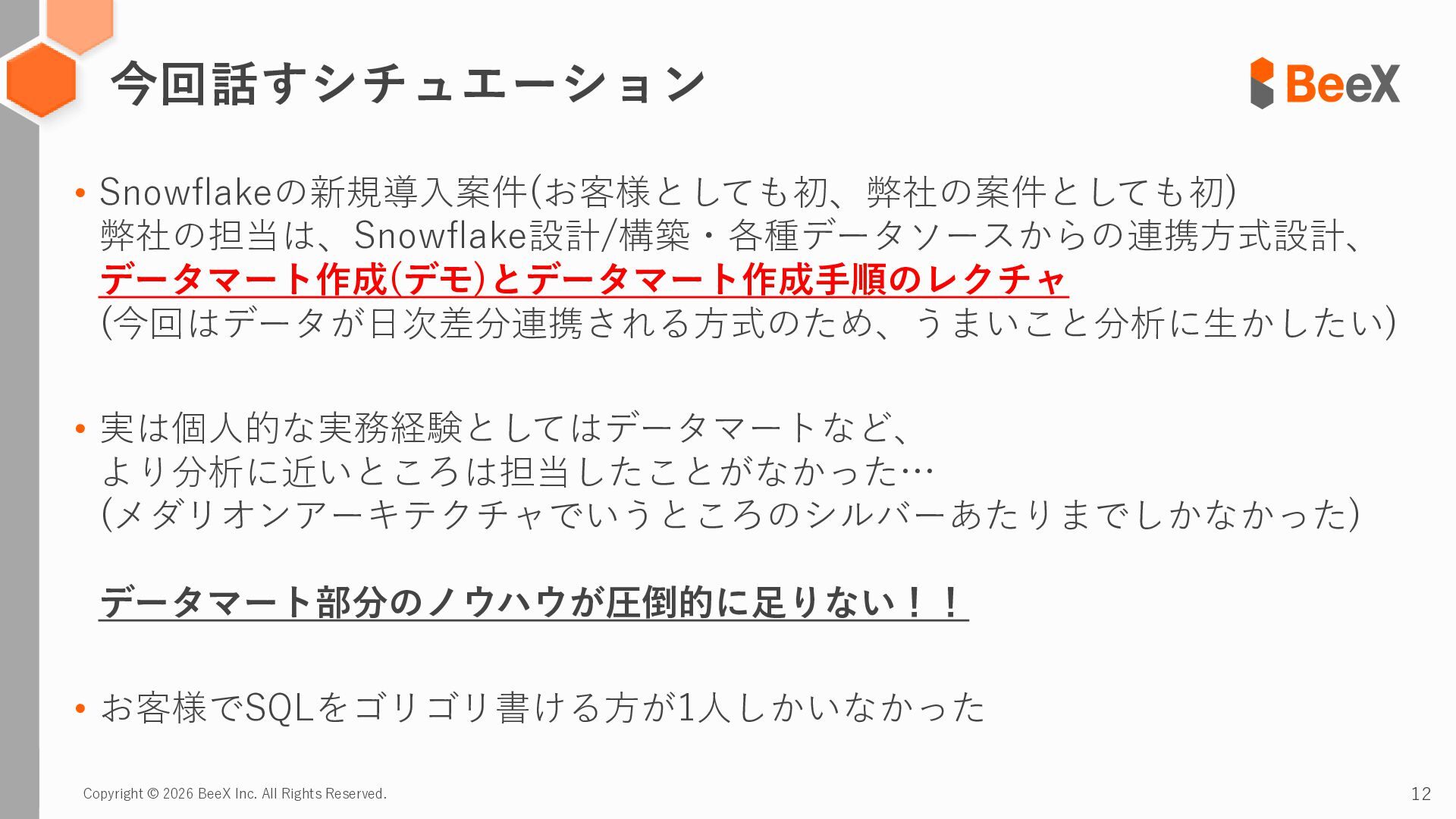 12. Copyright © 2026 BeeX Inc. All Rights Reserved. 12 今回話すシチュエーション