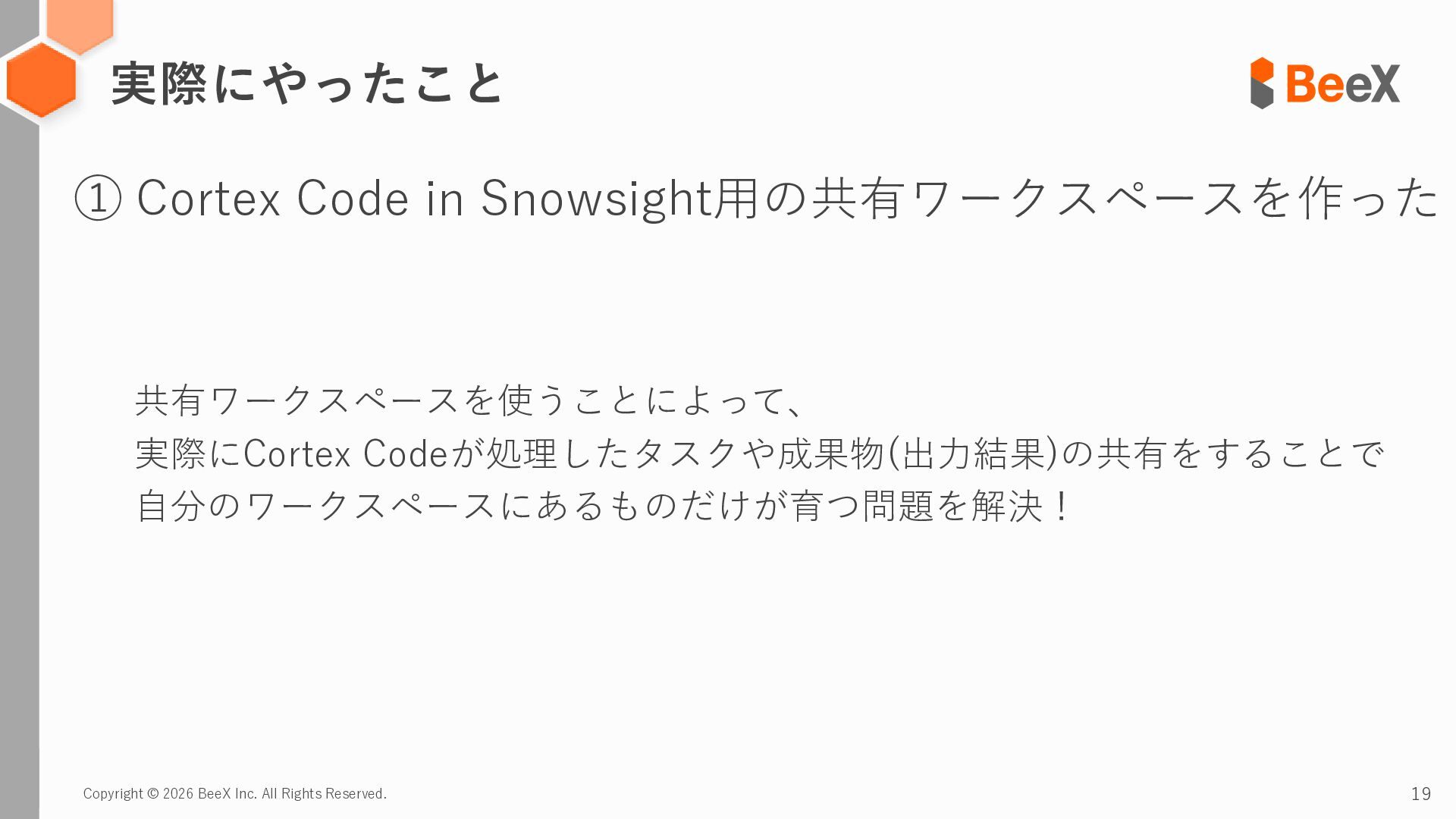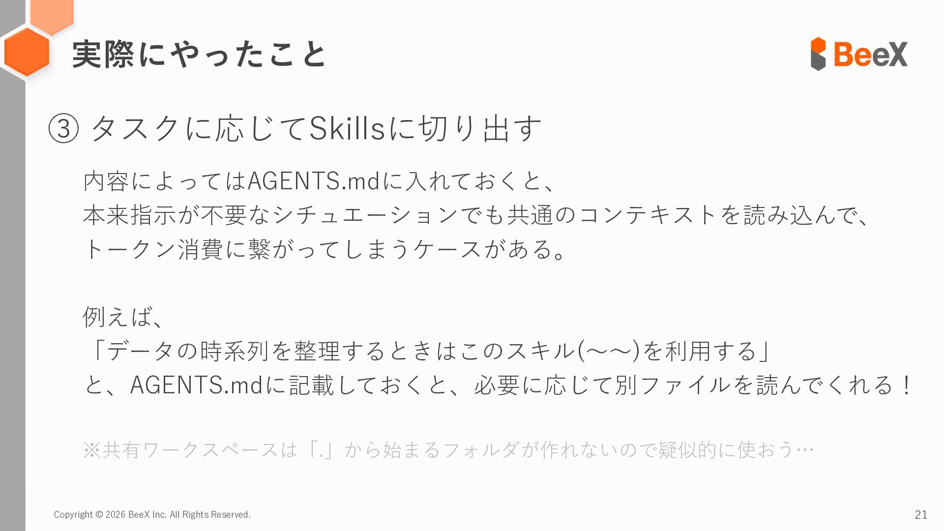 19. Copyright © 2026 BeeX Inc. All Rights Reserved. 21 実際にやったこと