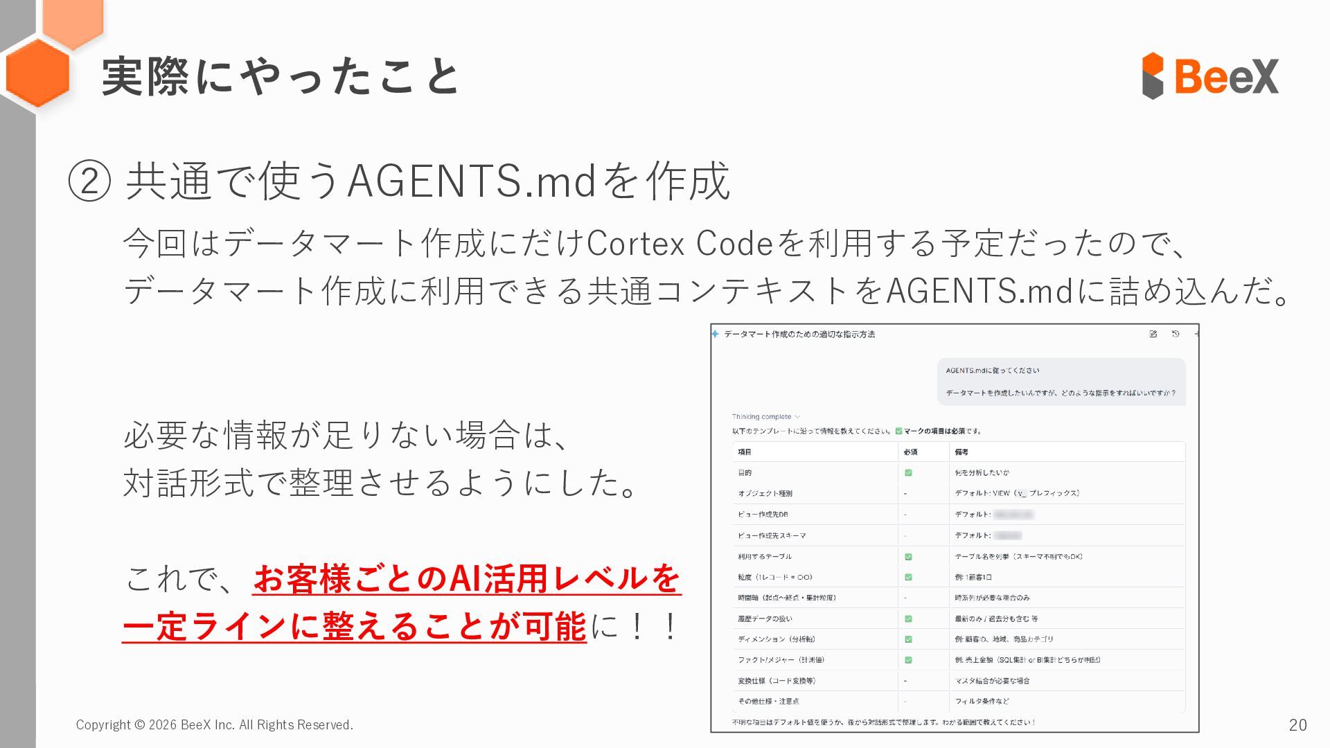 18. Copyright © 2026 BeeX Inc. All Rights Reserved. 20 実際にやったこと