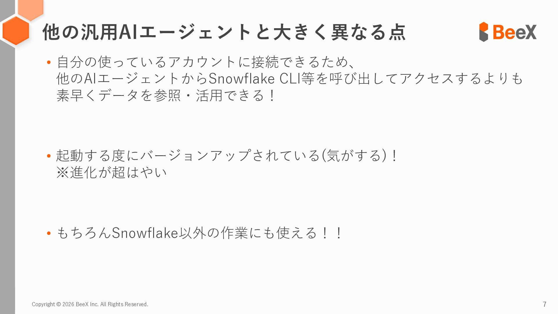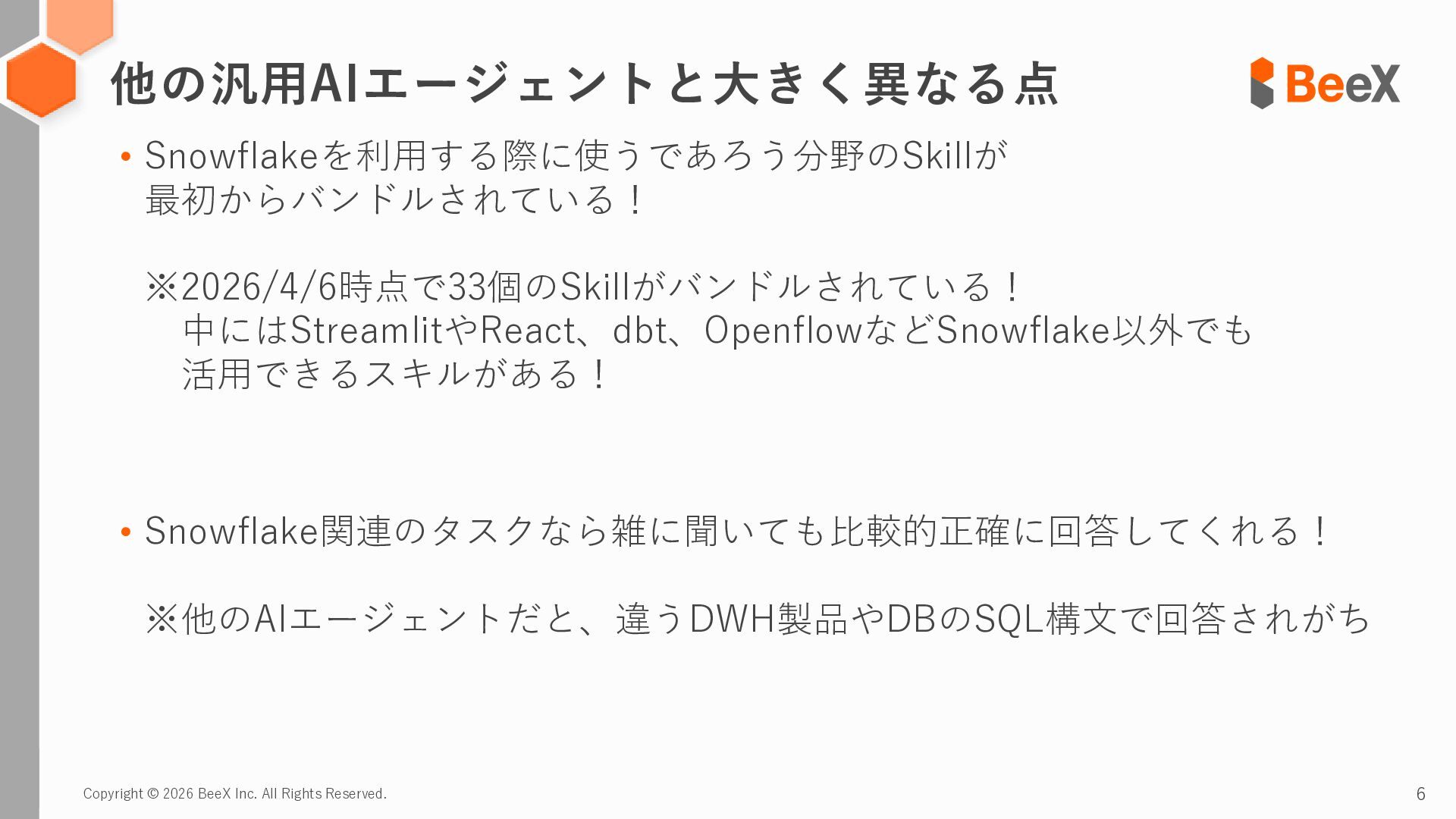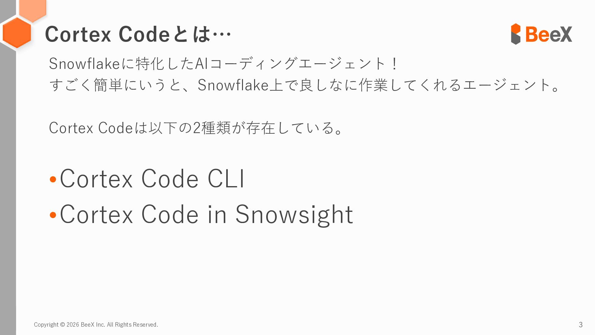 3. Copyright © 2026 BeeX Inc. All Rights Reserved. 3 Snowflakeに特化したAIコーディングエージェント!