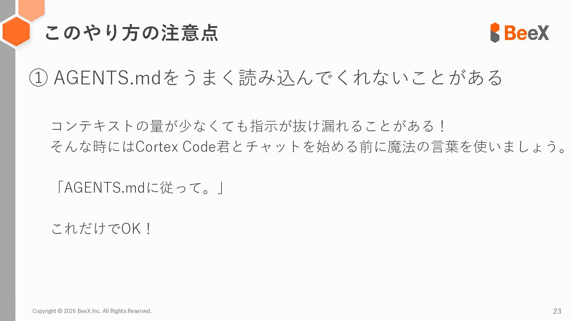 21. Copyright © 2026 BeeX Inc. All Rights Reserved. 23 このやり方の注意点