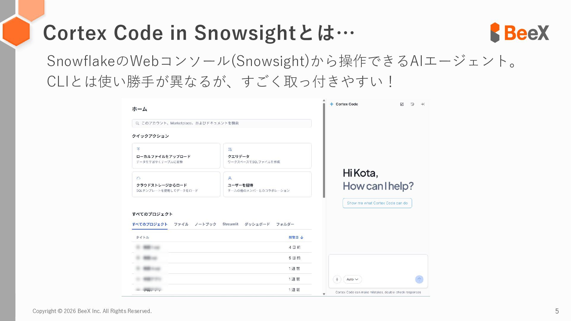5. Copyright © 2026 BeeX Inc. All Rights Reserved. 5 SnowflakeのWebコンソール(Snowsight)から操作できるAIエージェント。