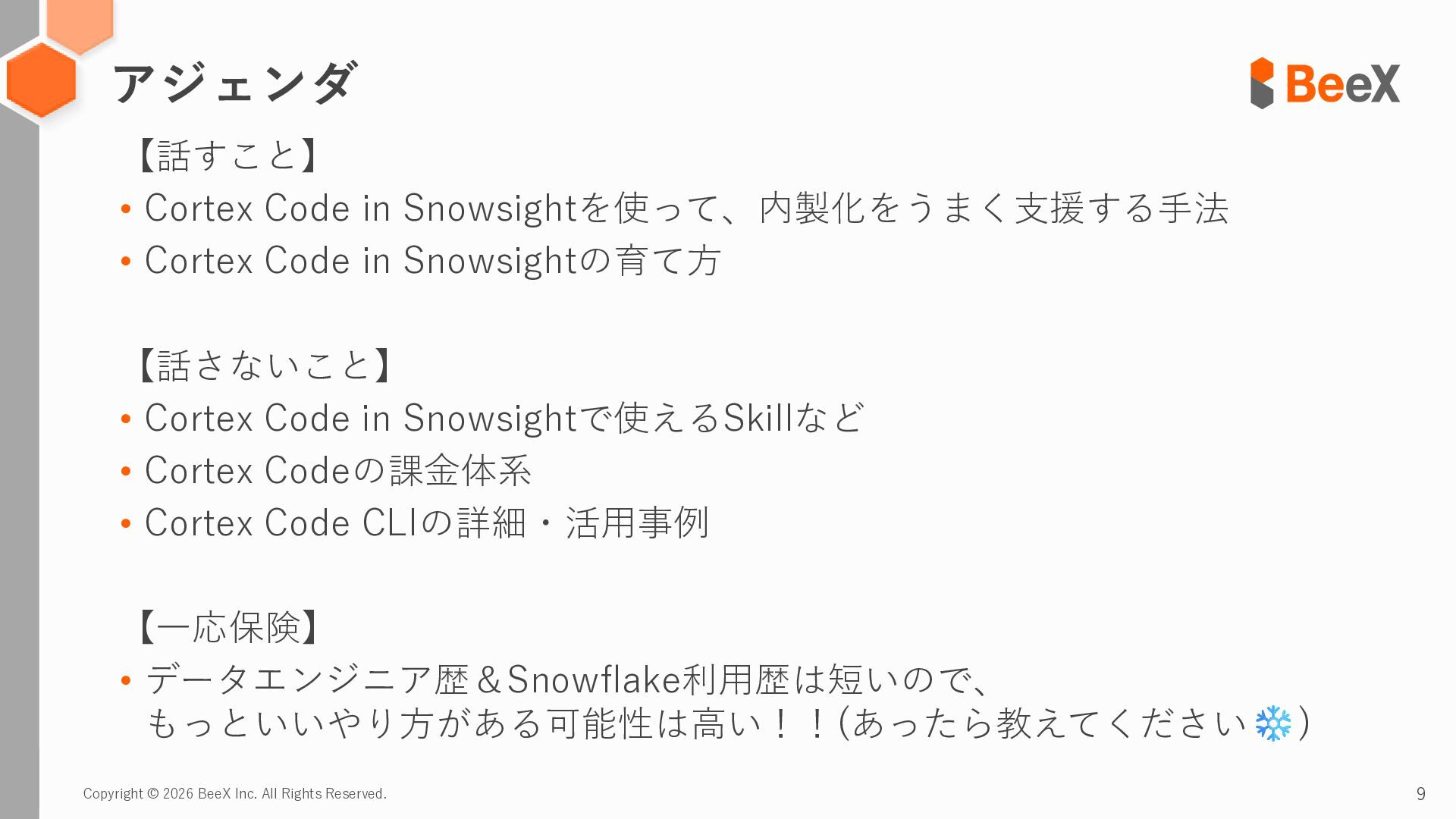 9. Copyright © 2026 BeeX Inc. All Rights Reserved. 9 アジェンダ